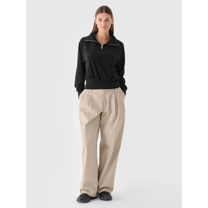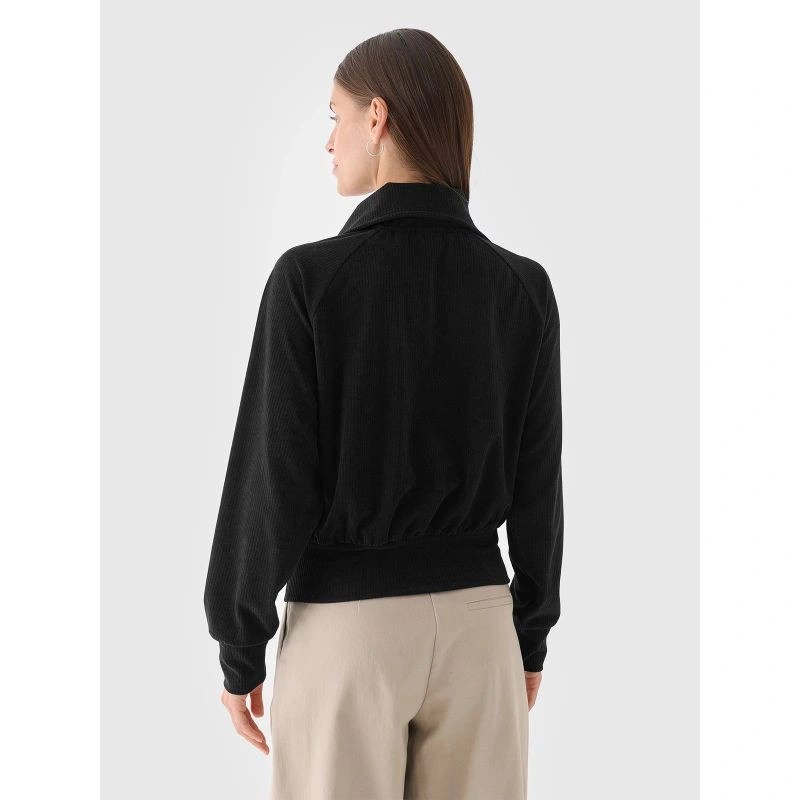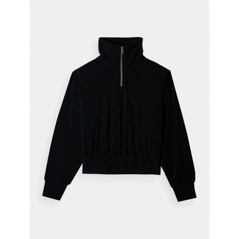 Mikina Tatodamvoľného strihu je vyrobená z velúru s jemným leskom. velúr má mäkký, elastický povrch, je pružný a elastický a veľmi dobre leží na tele. vďaka elastanu (5 %) je pružná a príjemná na telo. výstrih na zips. manžety a spodný okraj s rebrovaním. klasický strih bez vreciek. cez hlavu. raglánové rukávy neobmedzujú pohyb.