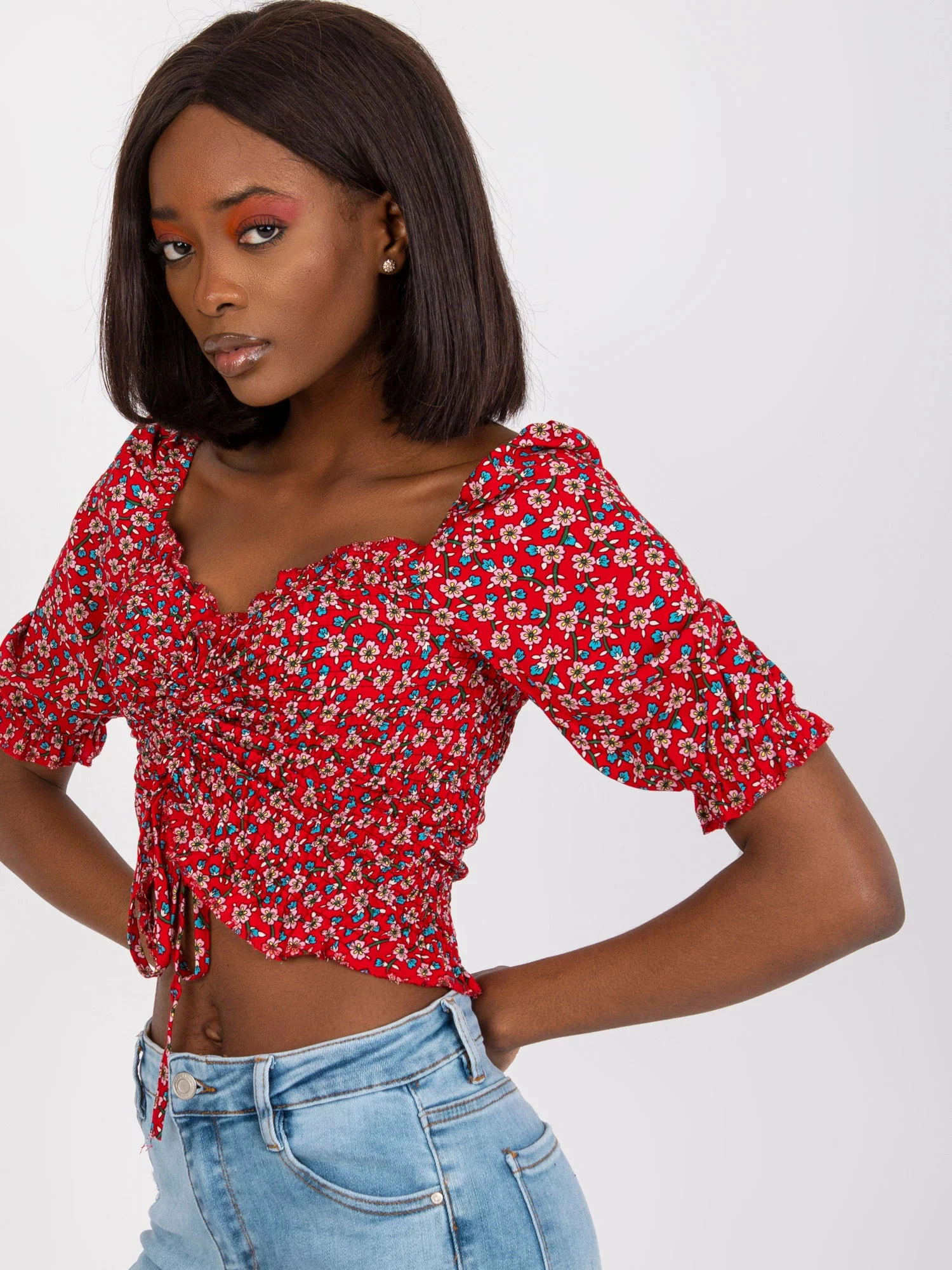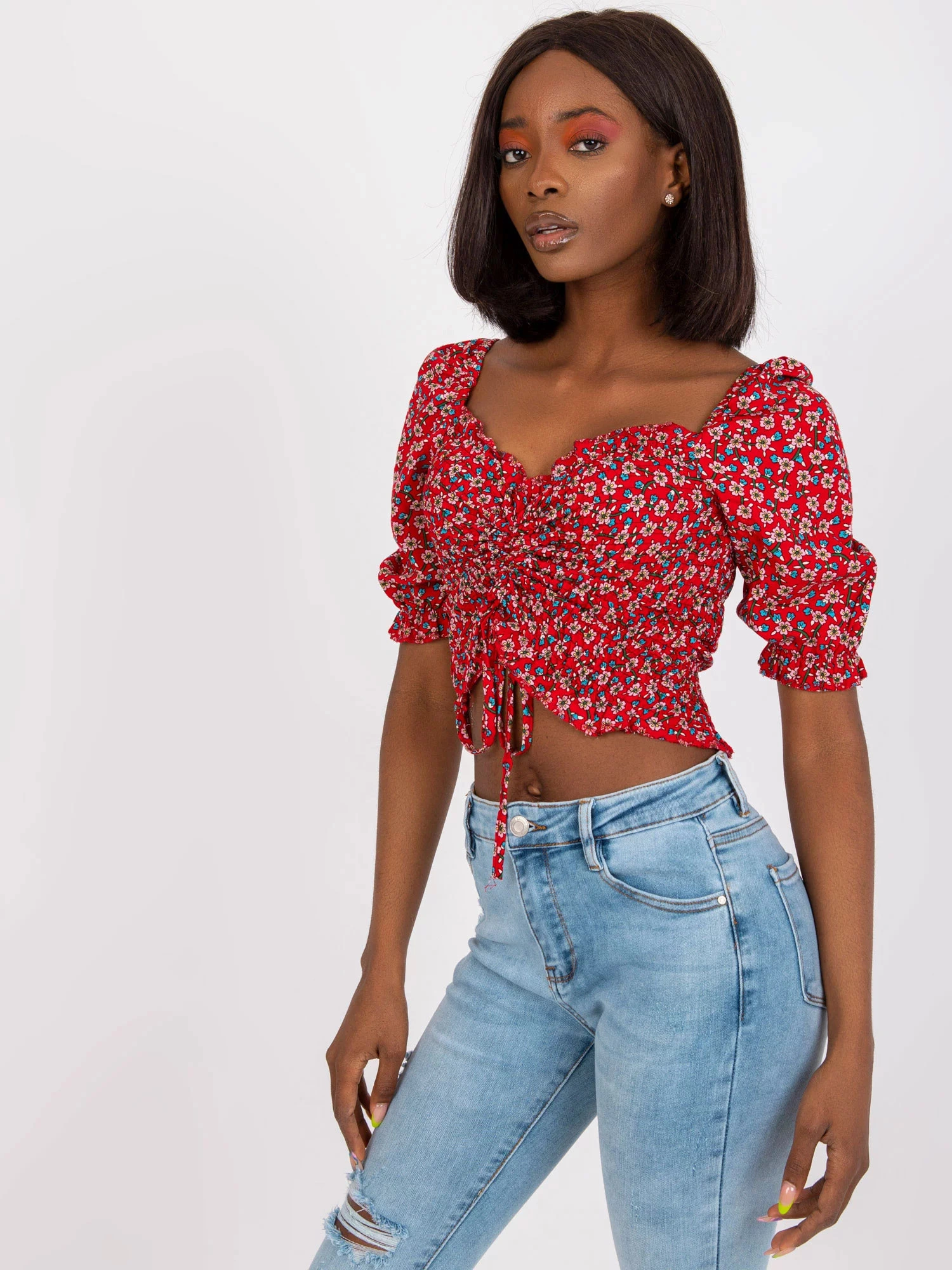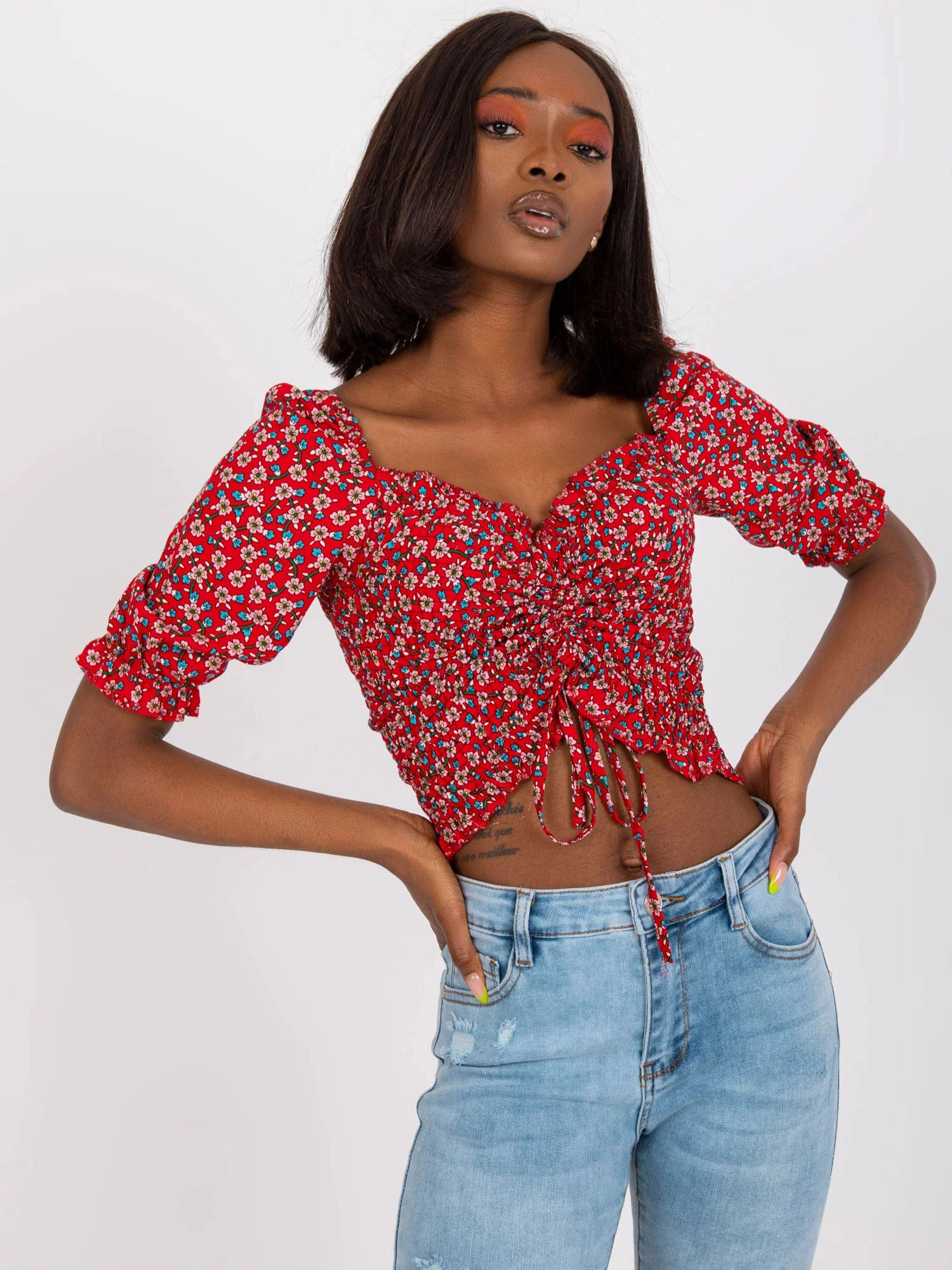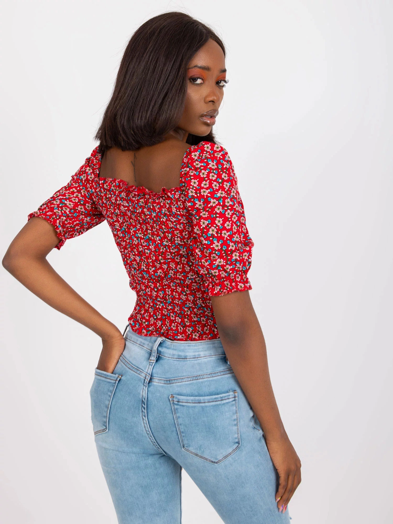 Modelka má na sebe veľkosť S. Miery modelky: výška 162 cm, prsia 80 cm, pás 63 cm, boky 80 cm.