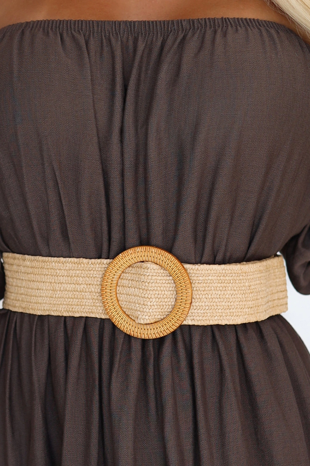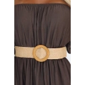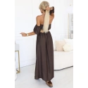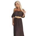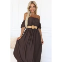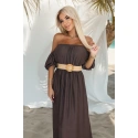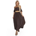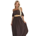 Tieto štýlové a pohodlné maxi šaty v boho štýle sú ideálnou voľbou na letné dni, prechádzky a dovolenkové výlety. Model s odhalenými ramenami a krátkymi lesklými rukávmi jemne zvýrazňuje ženské prednosti, zatiaľ čo elastický vrchný diel zaručuje pohodlné nosenie. Celok dopĺňa pletený opasok s ozdobnou sponou, ktorý krásne zvýrazňuje pás.