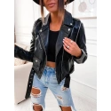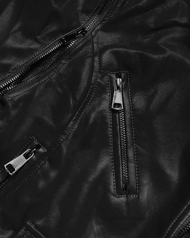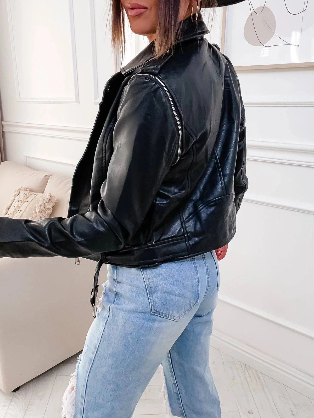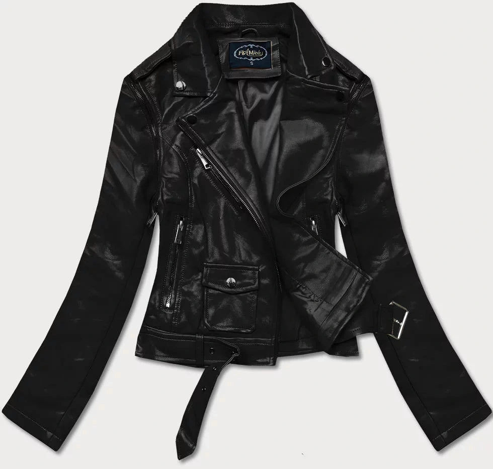 Bunda má jednoduchý strih, klopy, dve vrecká a zapína so zipsom. Model má dĺžku do pása a má všitý opasok s prackou.