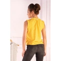 Očarujúca bodkovaná blúzka, ktorá sa hodí k ležérnym džínsom alebo ako elegantná verzia pod sako. Model v krásnej slnečnej farbe, bez rukávov, tu zdobený volánom. Pod krkom má pôvabnú stuhu previazanú mašľou.