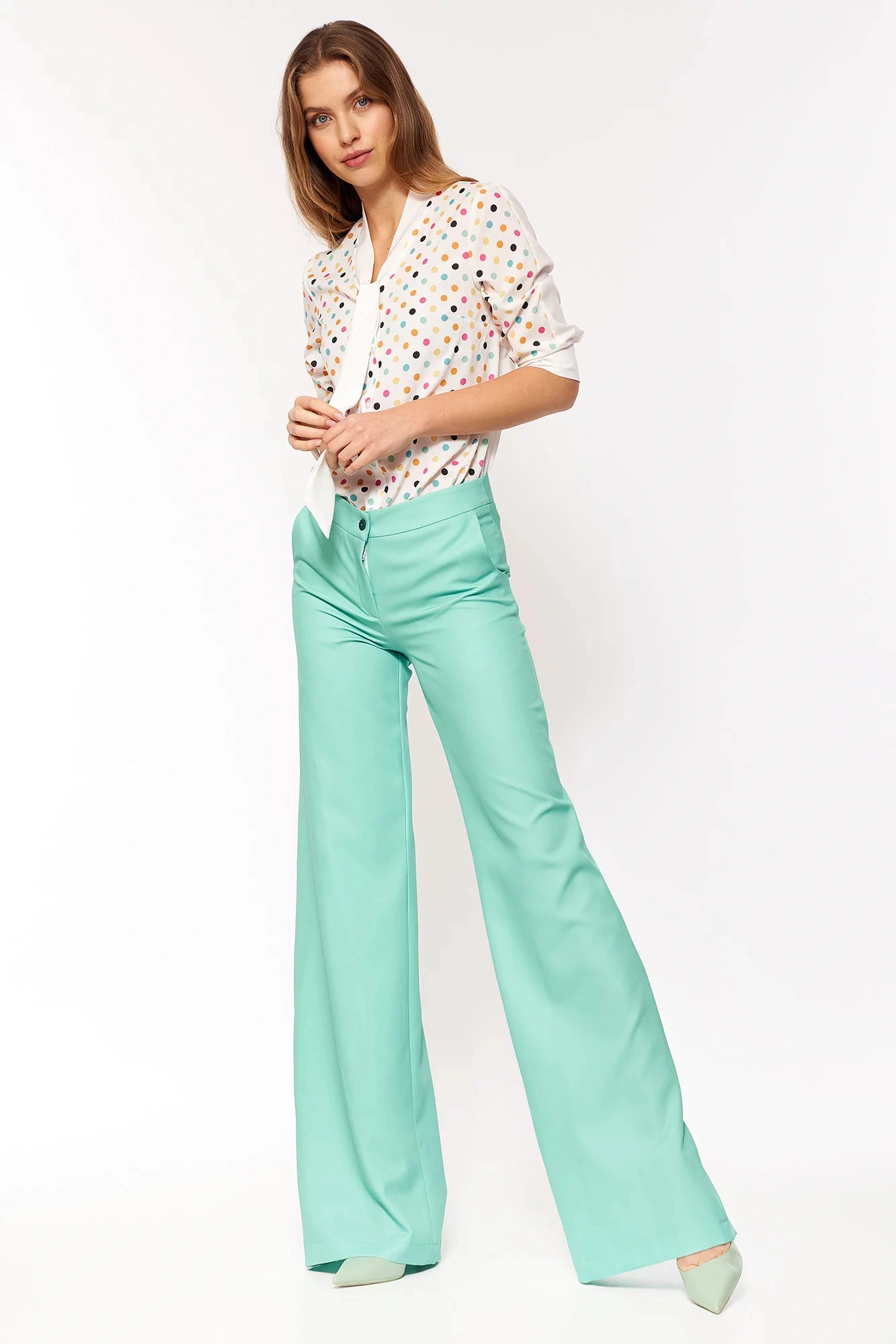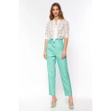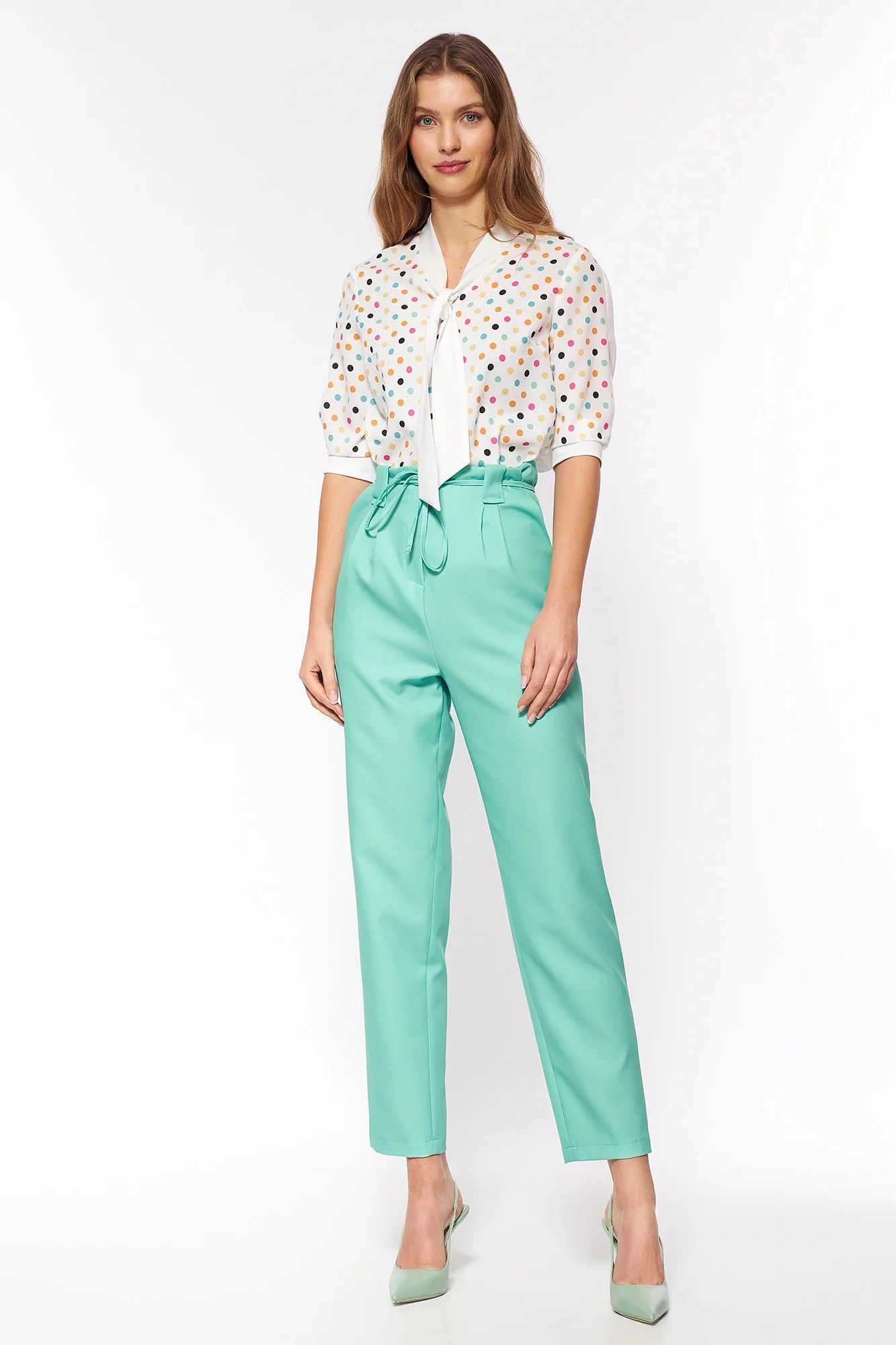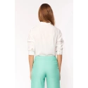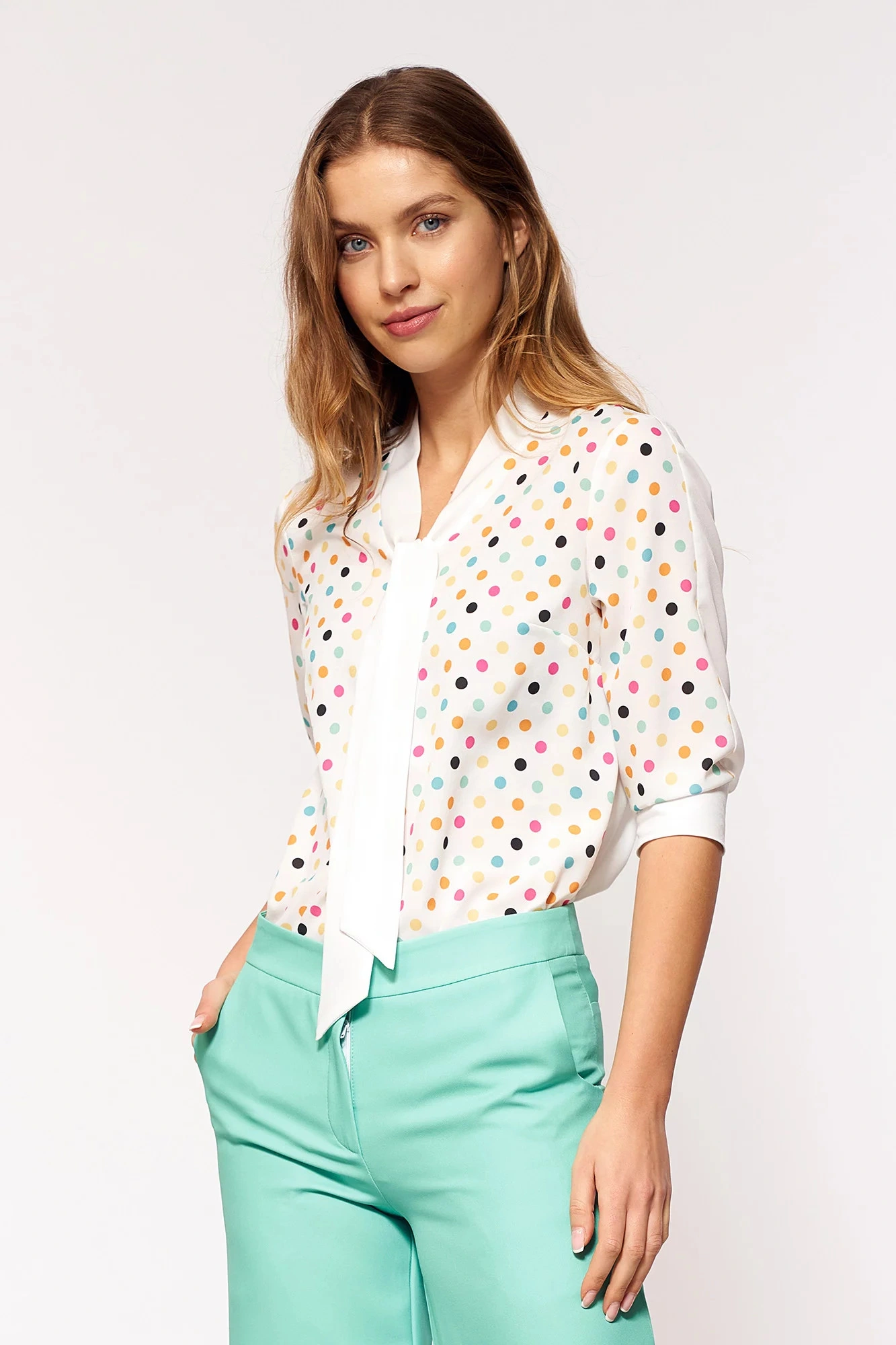 Priliehavá blúzka so zapínaním vpredu a výstrihom v tvare V, zapínanie na gombíky. Rukávy pod lakťom s manžetami na gombíky. Nepriesvitný materiál.