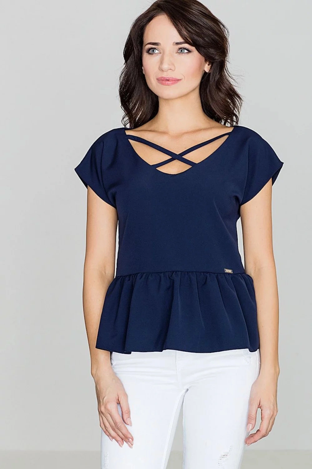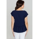Dámska blúzka z príjemnej na dotyk, mierne elastickej zmesi látok. Rovný strih s rukávmi decentne patriacimi na ramená. Model so širokým výstrihom do V spojeným skríženými pruhmi látky. Spodná časť je zakončená asymetrickým volánom, vďaka ktorému sa pekne prispôsobí bokom. Plaketa s názvom značky na boku.