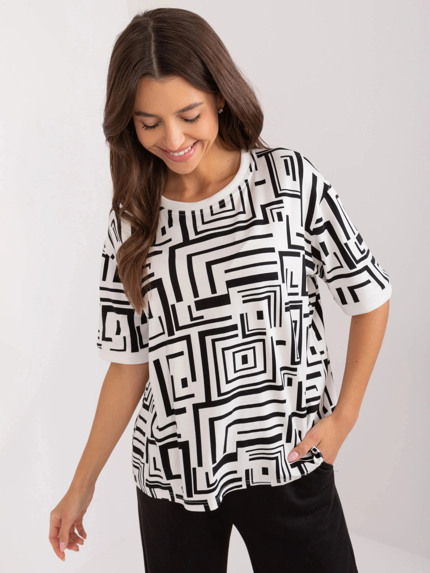 Rozmery blúzky v jednej veľkosti merané na plocho: šírka v podpazuší - 56 cm, celková dĺžka - 58 cm.