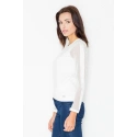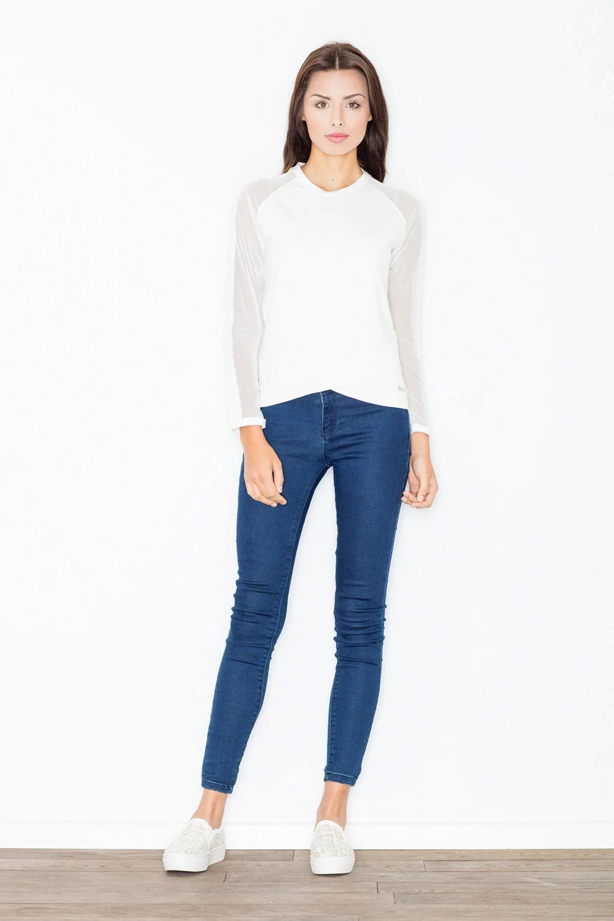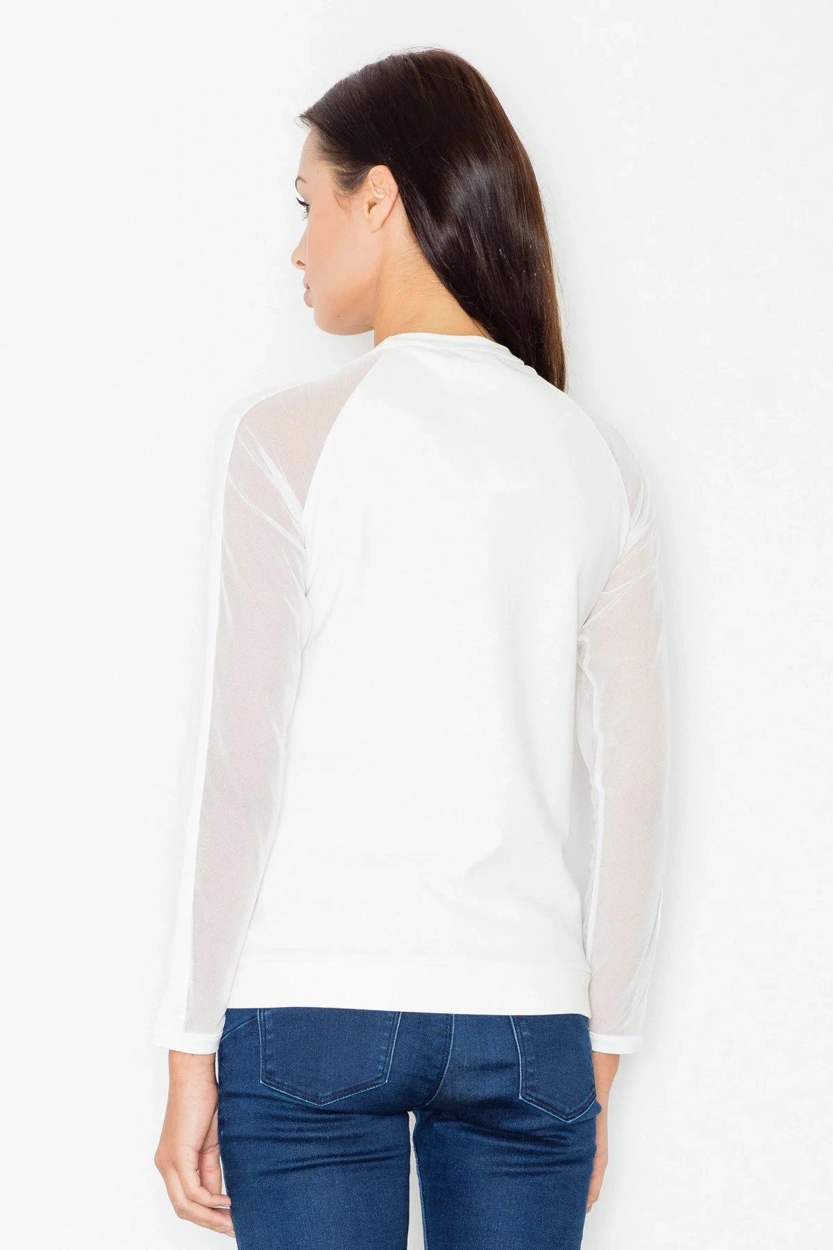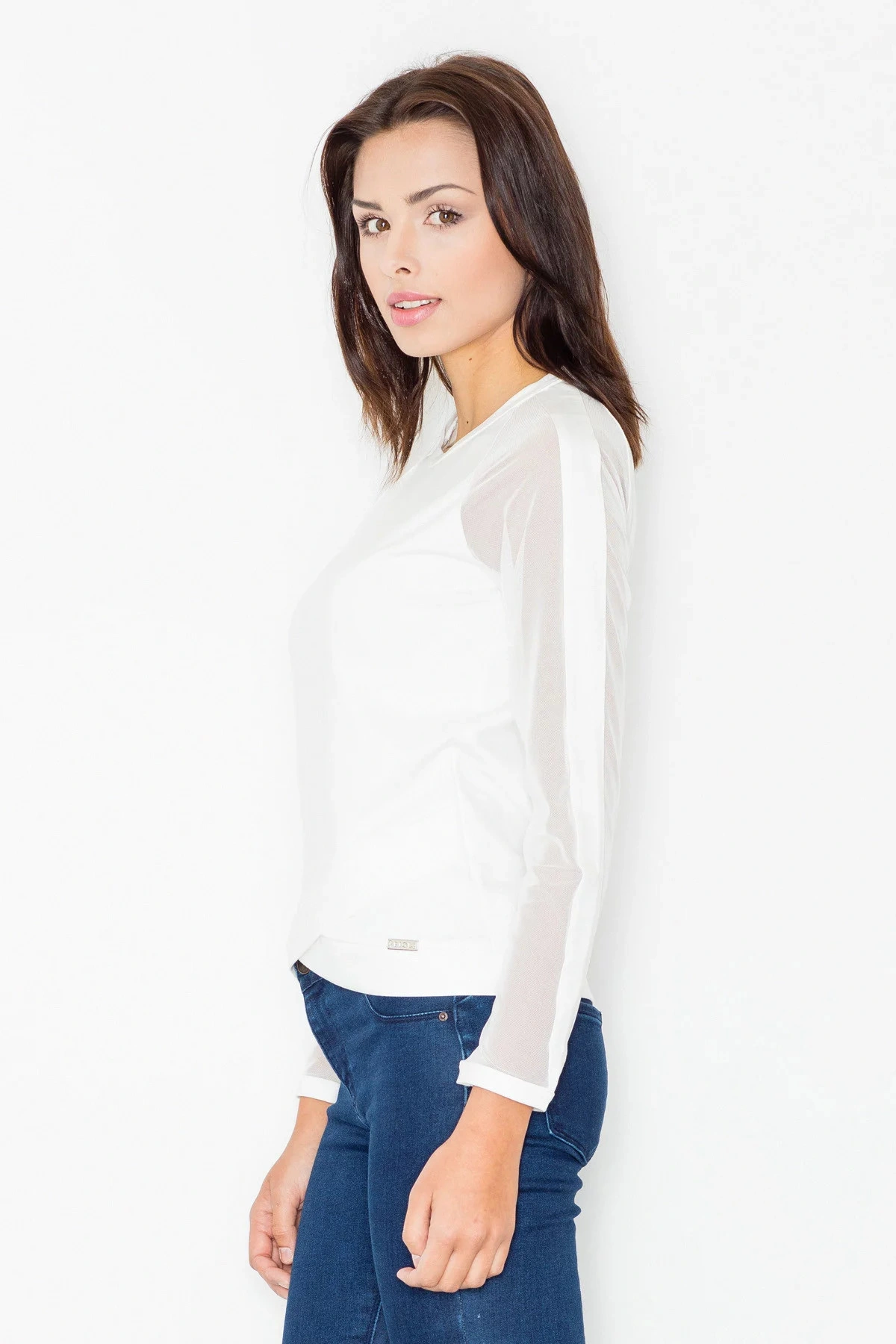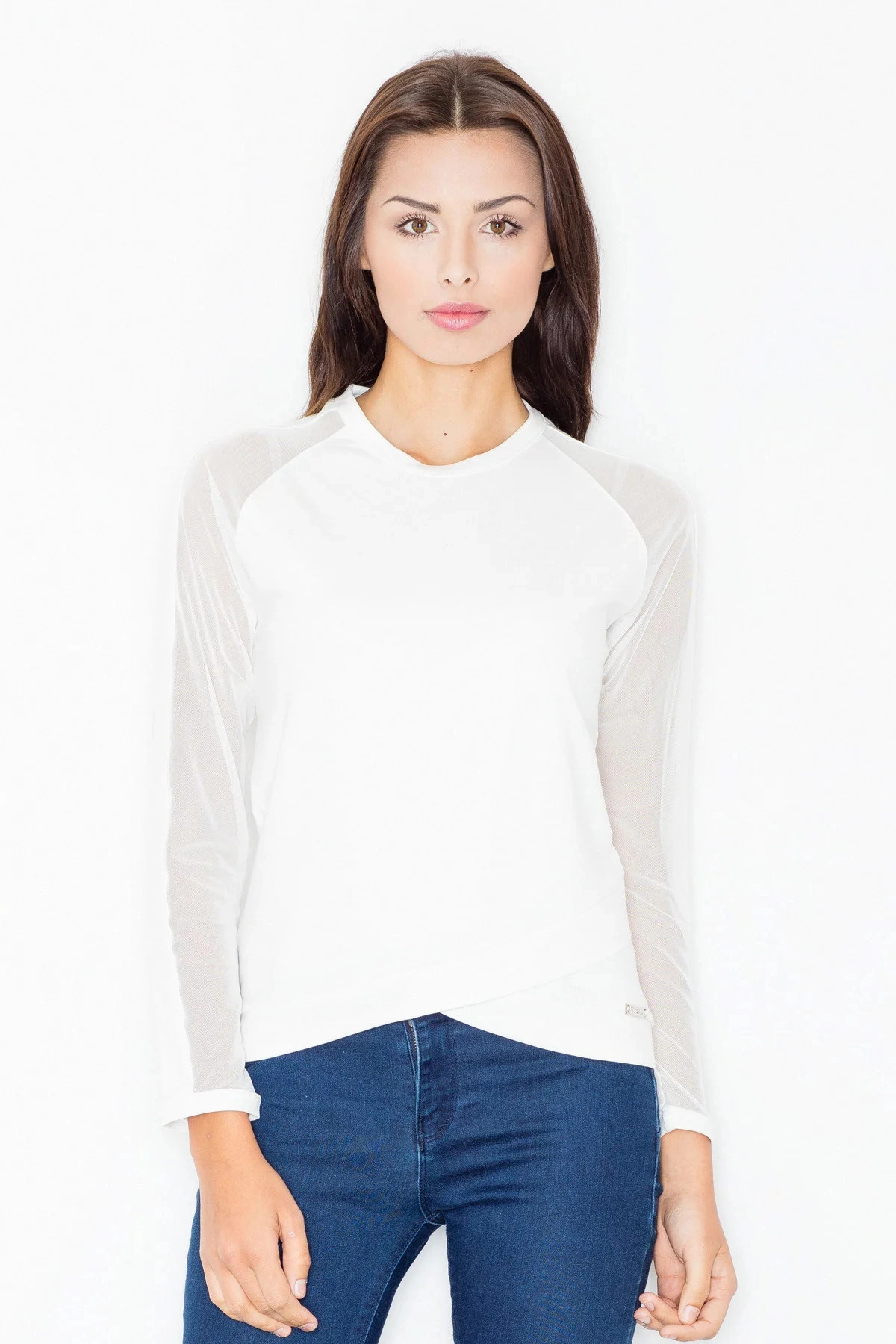 Dámska blúzka s tylovými dlhými rukávmi. Rafinovaný strih na spodnej časti blúzky. Okolo krku okrúhly výstrih.
