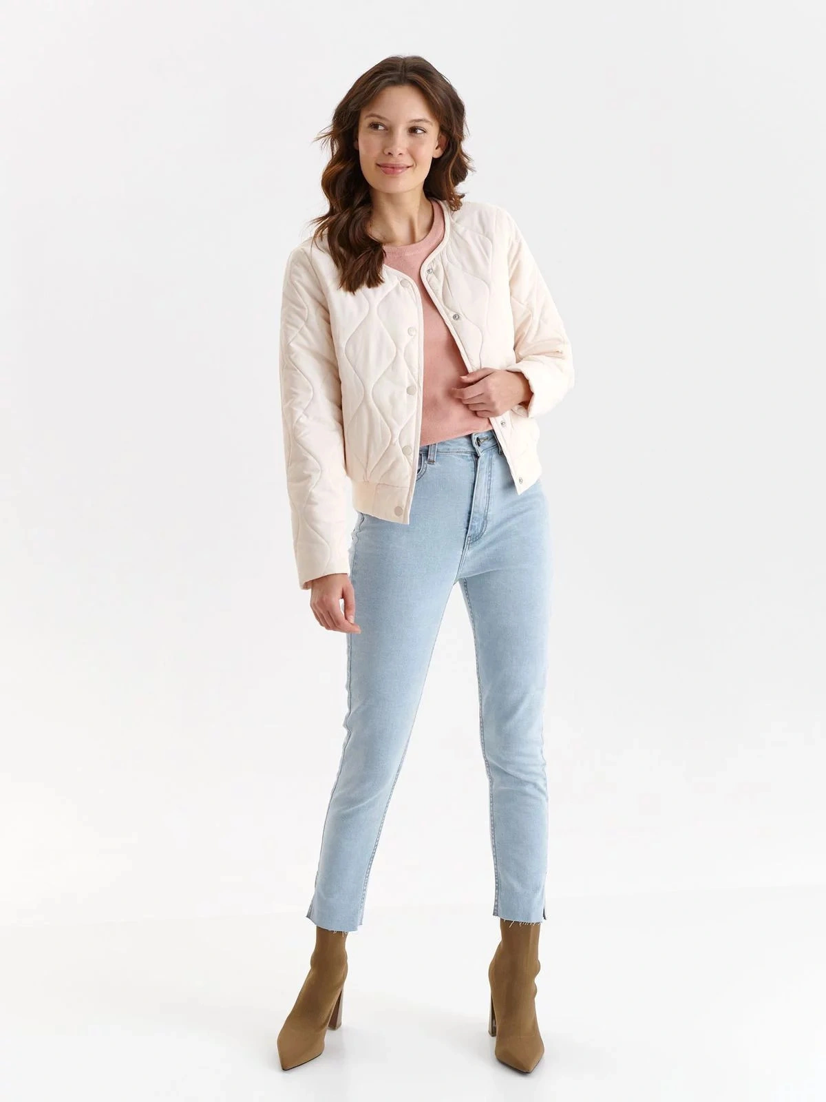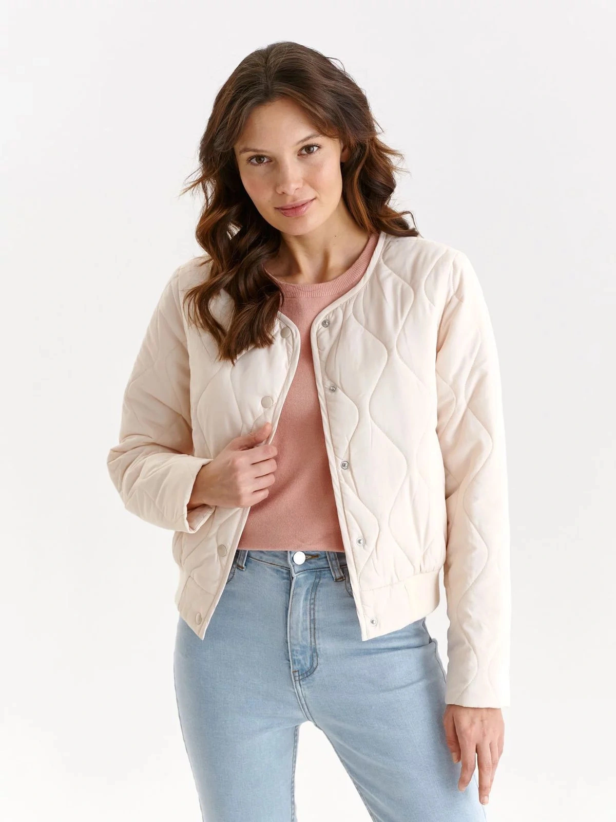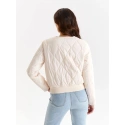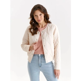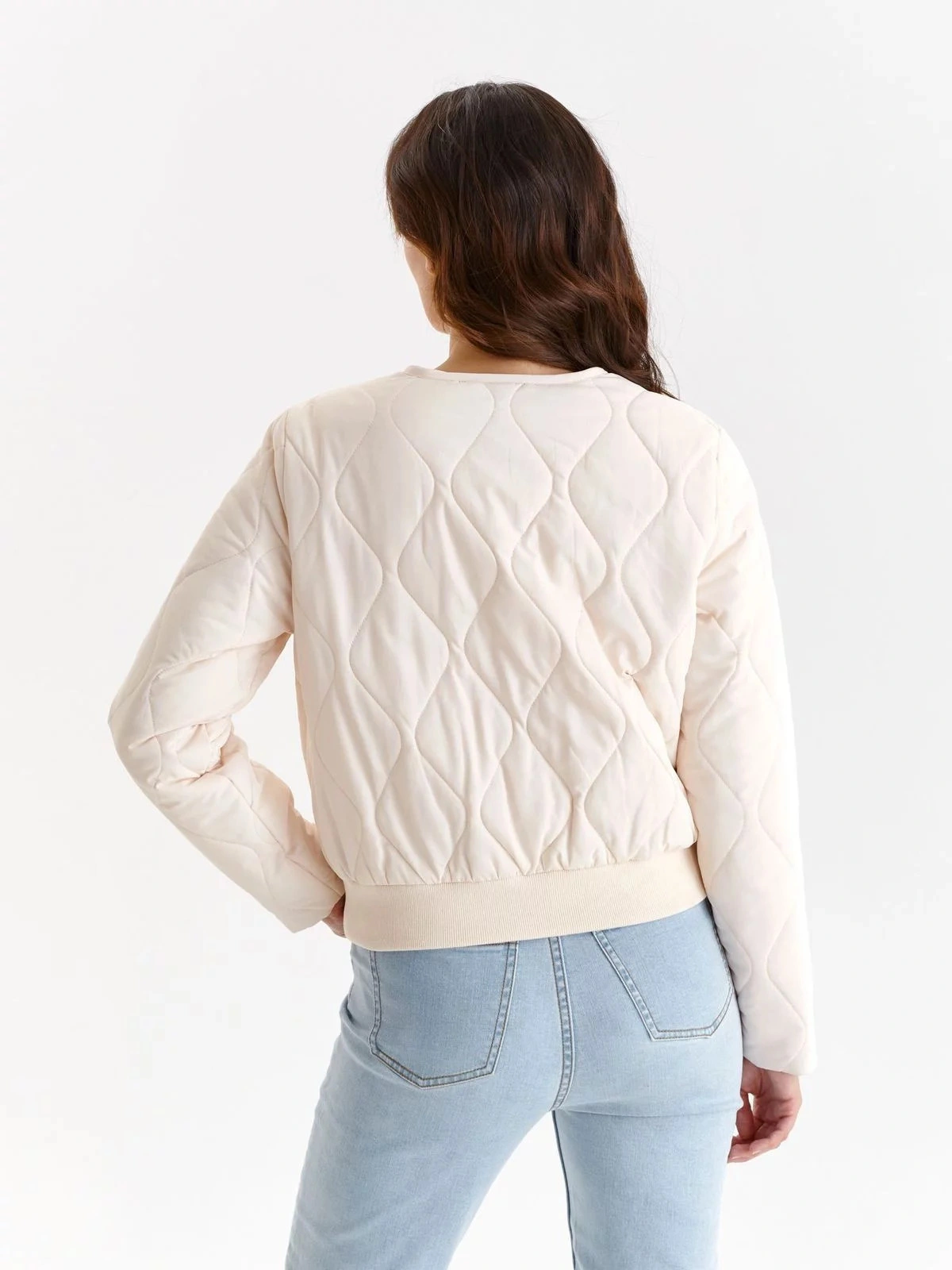Táto krátka dámska bunda bomber je neuveriteľne praktická a pohodlná pri používaní, má rovné dlhé rukávy. Má široký sťahovací lem, zapína sa vpredu na patentky a zdobí ho nápadité prešívanie v podobe symetrických vírov. Má praktické vrecká na bokoch a je vyrobená z úpletu veľmi príjemného na dotyk, ktorý dokonale doplní prakticky každú dámsku ležérnu štylizáciu počas chladnejších dní a nocí.