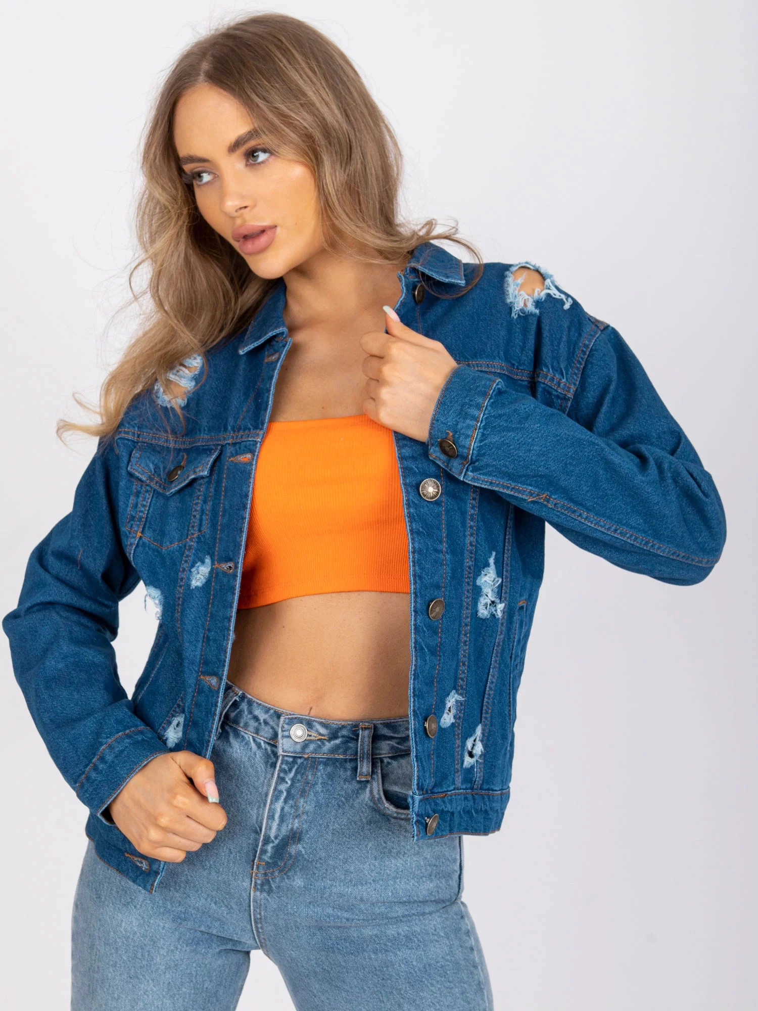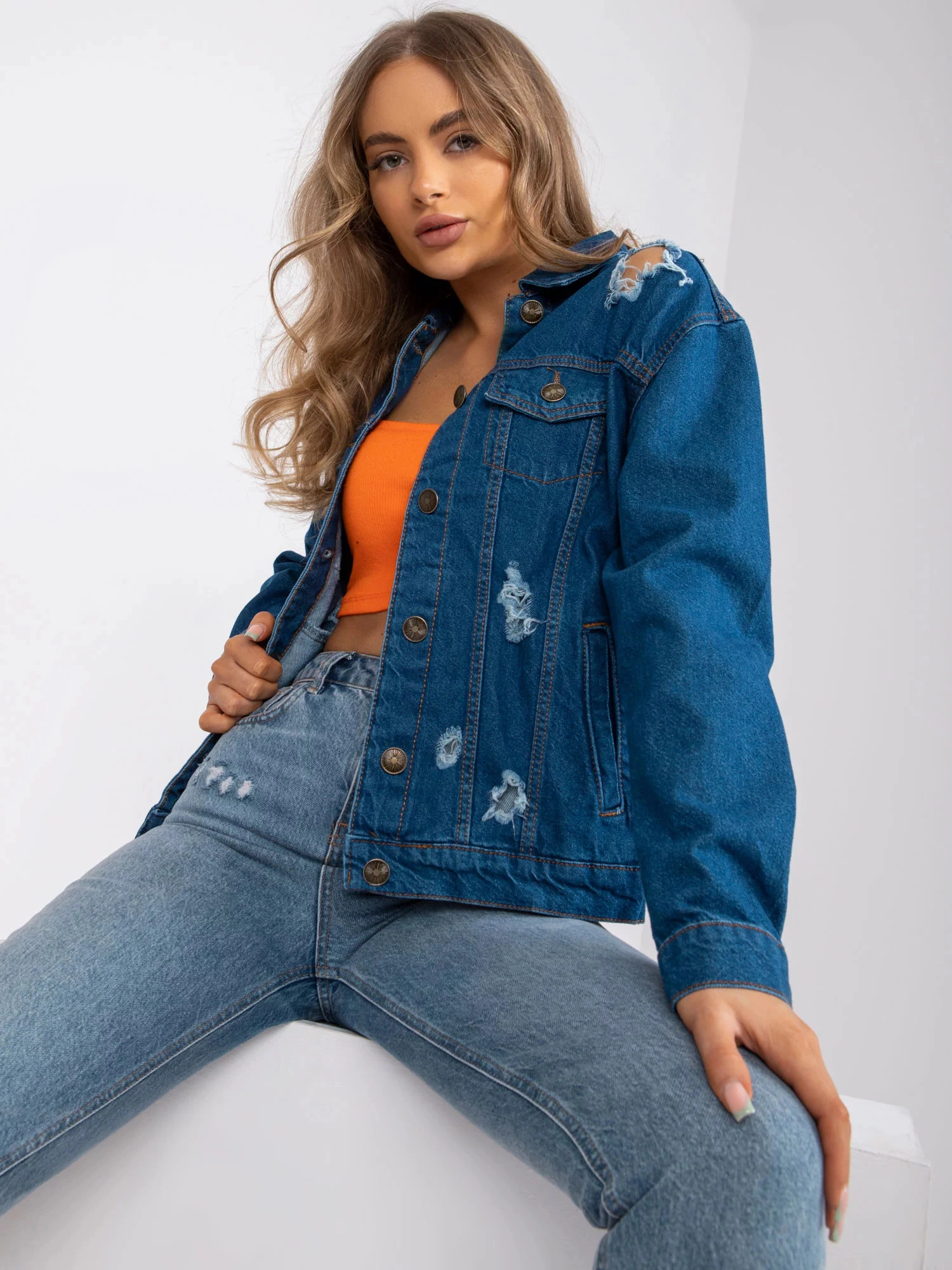 Modelka má na sebe veľkosť S. Rozmery modelky: výška 174 cm, prsia 83 cm, pás 62 cm, boky 96 cm.