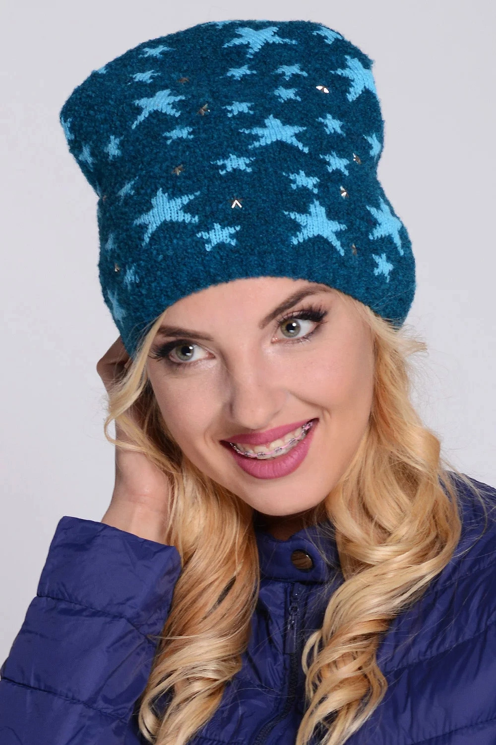 Dvojvrstvová dámska čiapka s huňatým brmbolcom. Lem čiapky je ozdobený bižutérnym prvkom. Dostupné f