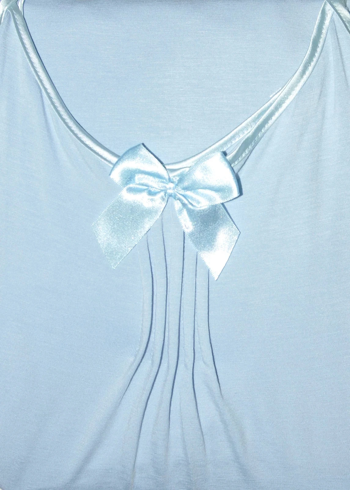 Model má úzke saténové ramienka, ktorých dĺžku možno nastaviť. Výstrih modelu zdobí mašlička a jemný volánik.