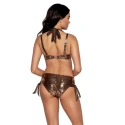 Multifunkční plavky udělají na pláži opravdový rozruch a množství podob, které SK 166 má, je opravdu působivé. Tato vyztužená podprsenka bardotka poskytuje stabilní oporu a dokonale tvaruje poprsí i po odepnutí ramínek. Zajímavým nápadem je všití širokého měděného pásku do boků podprsenky, který lze uvázat mnoha způsoby: jako ozdobný uzel na zádech, vpředu na prsou v podobě efektní mašle nebo na zátylku jako podpůrnou oporu prsou. Elastický úplet strój je celý pokryt hadím potiskem, který na povrchu látky vytváří jemnou strukturu, a samotné plavky se krásně třpytí kovovými třpytkami. Sada obsahuje kalhotky SF 166/10 a podprsenku SF 166/10/B s koketním starozlatým vázáním na bocích.