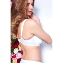 Biela vystužená balkónová podprsenka so zmyselnými košíčkami z kvetinovej čipky. Ideálne pod hlboký výstrih šiat alebo blúzky. Medzi šálkami je jemná mašlička. Model má vpredu široké a vzadu úzke nastaviteľné ramienka, ktoré dokonale podržia aj veľké a ťažké poprsie. Tento strih je ideálny pre hlboký výstrih šiat alebo blúzky.