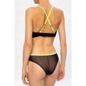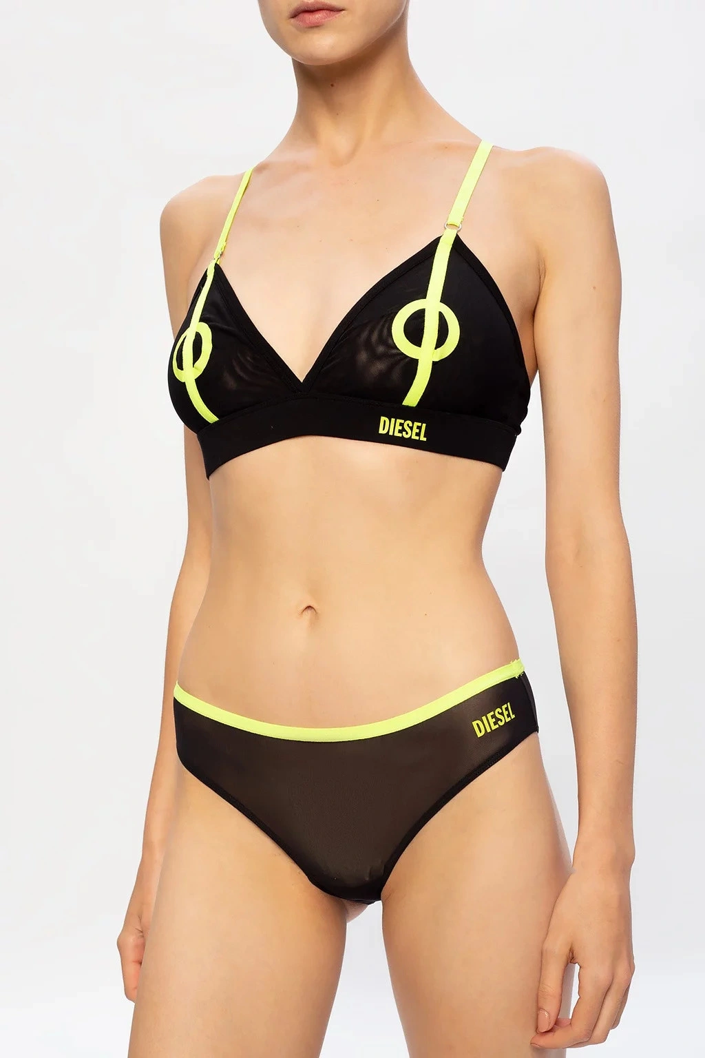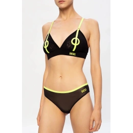 Čierno zelená podprsenka značky Diesel. Tento model je vyrobený z polopriehľadné strečové textílie a má vyšívané ramenné popruhy s logom, ramienka sú výškovo nastaviteľné.