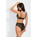 Košíčky sú vyrobené z mäkkej béžovej sieťoviny, ktorej povrch je pokrytý zložitou čiernou výšivkou, ktorá dodáva podprsenke eleganciu a decentný šarm. Košíčky sú lemované silikónovým lemovaním, ktoré zaručuje dokonalé prispôsobenie. Ramienka sú zdobené zlatými krúžkami, ktoré dodávajú podprsenke jedinečný nádych.