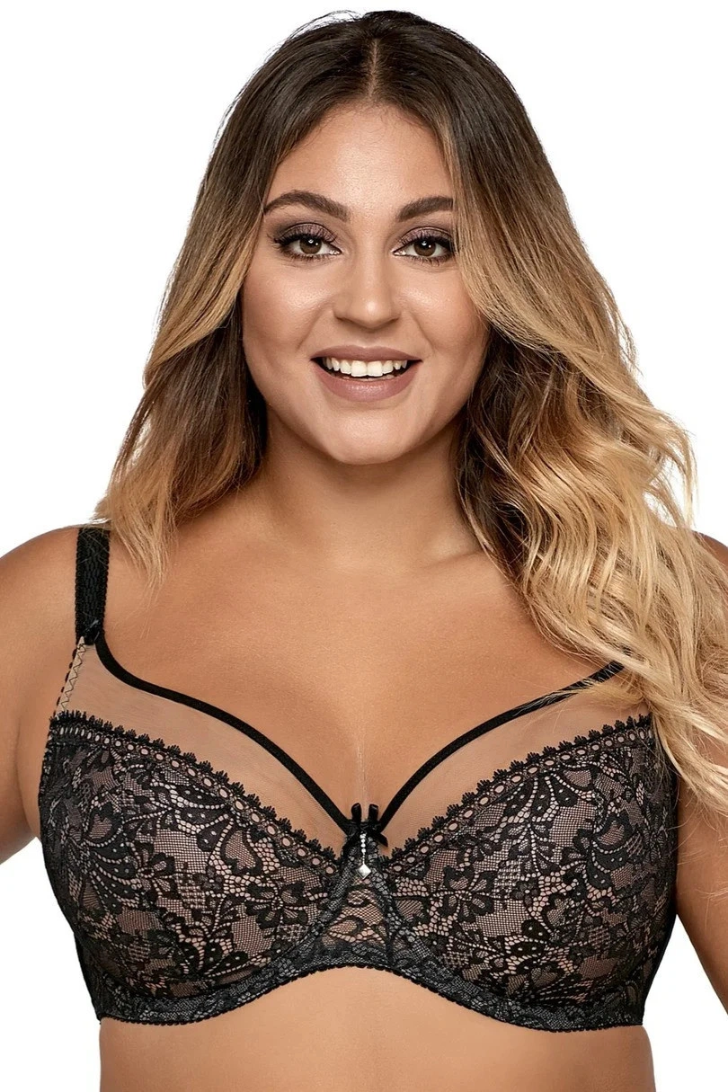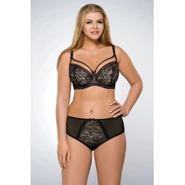 Mäkká podprsenka. vrchná časť košíčkov je vyrobená z béžového tylu. medzi košíčkami je ozdobný korálik. boky sú z pevnej látky, ramienka nie sú odnímateľné. k súprave sú k dispozícii nohavičky a tangá.