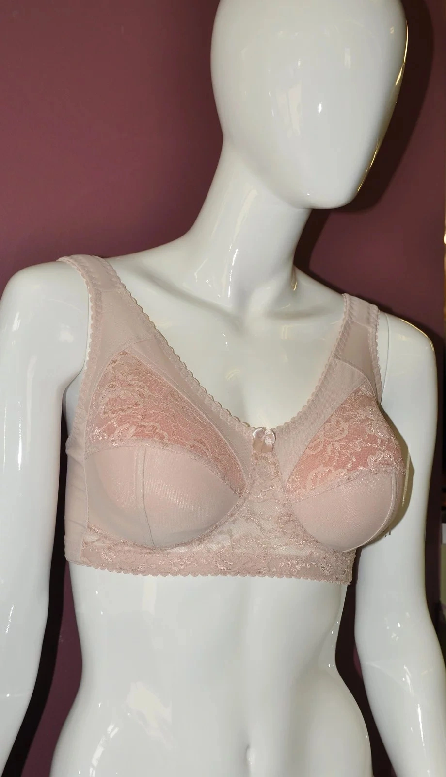 Mäkké košíčky nemajú kostice. Podprsenka je vyrobená zo sieťoviny a je do polovice podšitá tkaninou. Horná časť košíčkov je priesvitná a je ozdobená čipkou. V mieste spojenia košíčkov je saténová mašlička. Pohodlné široké ramienka sú zárukou komfortu pri nosení.