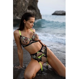 Táto koketná a precízne spracovaná mäkká podprsenka bez kostíc je hitom v odhaľujúcej žltej neónovej farbe. Sľubujeme, že keď si oblečiete tento výrazný doplnok šatníka, nezostanete bez povšimnutia. Krásne odtiene sýto žltej farby sa prelínajú s bielymi a čiernymi kvetinovými výšivkami. Model je priehľadný, čo zvýrazní vaše oblé prsia a podčiarkne detaily. Vďaka vypchávkam v podobe drôtikov v košíčkoch dokonale podopiera poprsie a dodáva mu krásny tvar. Zadná časť modelu je zakončená príjemným tylom vo farbe jemnej béžovej, ramienka sú neodnímateľné, ale nastaviteľné. Dvojité zapínanie na háčiky a očká.