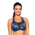 Odpružená konštrukcia založená na podpornej kostnej štruktúre sa osvedčí aj v extrémnych podmienkach. Košíčky sú vyplnené tenkou, mäkkou penou a podšité sieťovinou odvádzajúcou vlhkosť, čo maximalizuje funkčnosť a pohodlie podprsenky. Široké popruhy s otvorom na chrbte sú vystlané mäkkou penou a chrbát je vystužený stabilnou recyklovanou tkaninou. Všetky výstužné pásy sú ukryté vo vnútri, čo dodáva podprsenke estetickejší vzhľad. Dizajn je v pokojnom odtieni námorníckej modrej, posiaty ženskými farbami a výstrih je ešte zvýraznený fuksiovým lamé.