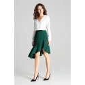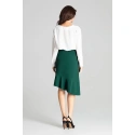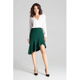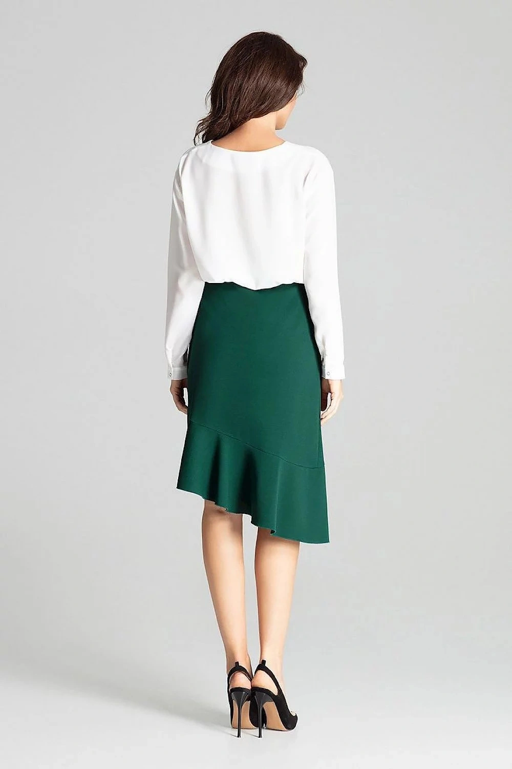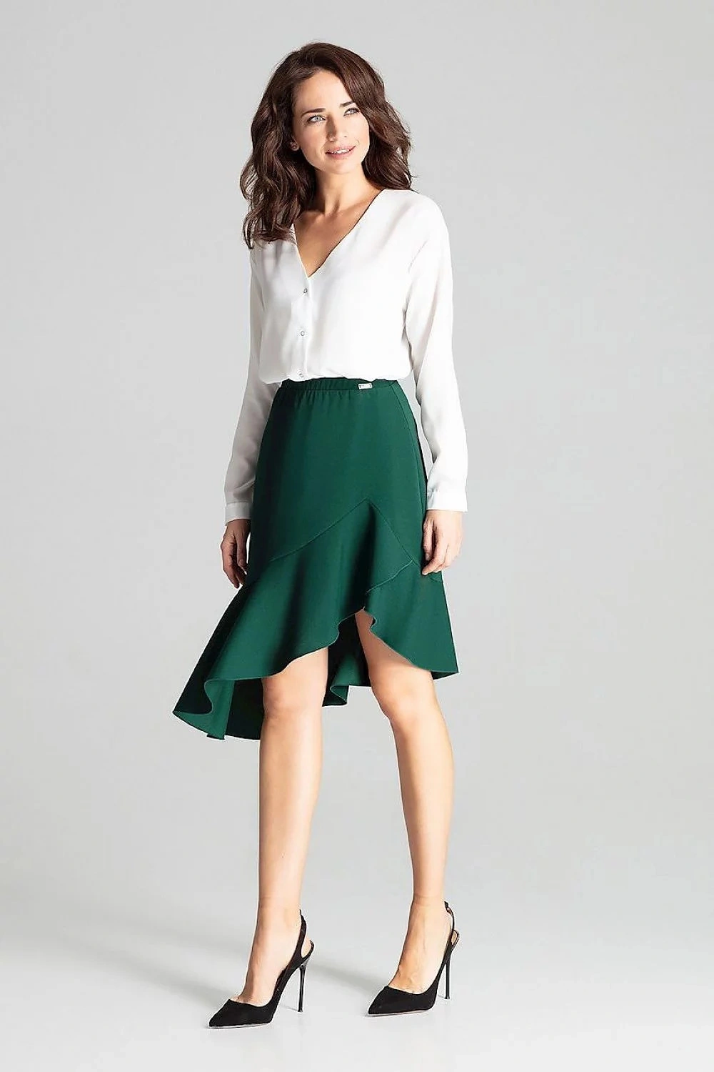 Tmavo zelená asymetrická midi sukňa s volánom. V páse je všitá široká guma. Bez podšívky a bez vreciek.