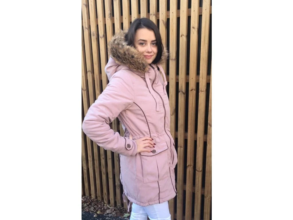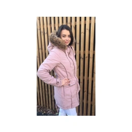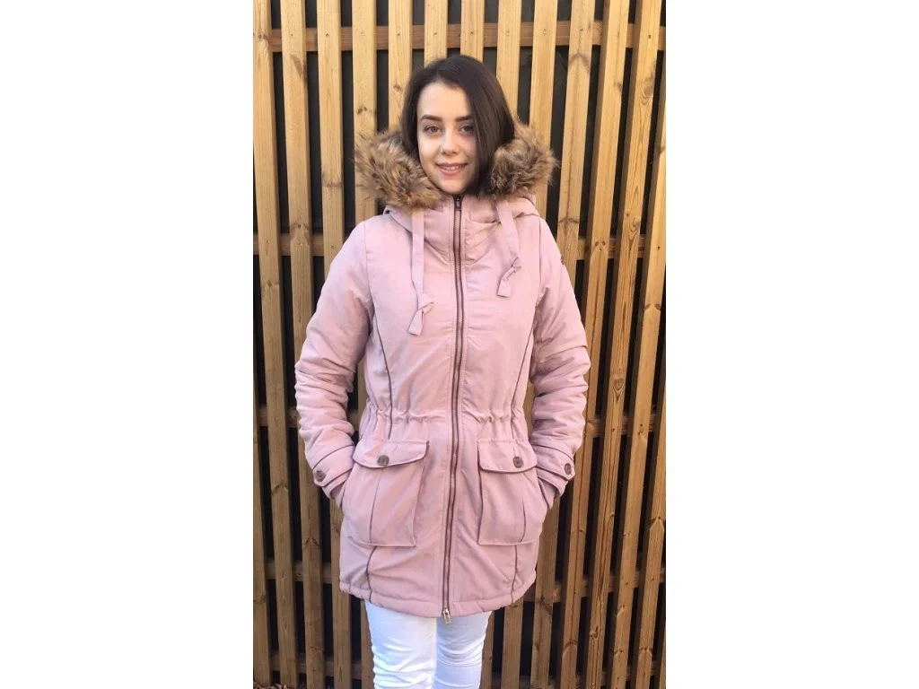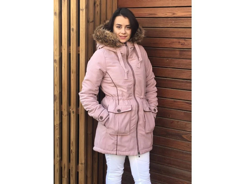 Dámska zimná bunda má kapucňu na šnúrky s odnímateľnou kožušinou. Šírku pása možno upraviť pomocou prídavných šnúrok, rovnako ako spodnú časť kabáta.Na prednej strane kabáta sú dve funkčné vrecká, rukávy sú zakončené všitou nášivkou s otvormi na palec. Bunda je tiež vybavená vnútorným náprsným vreckom. Vnútorná kožušina vám v zime poskytne skvelý pocit tepla.Zaobstarajte si tento módny kúsok do svojho šatníka.