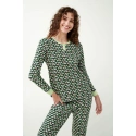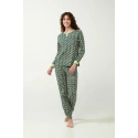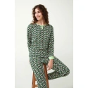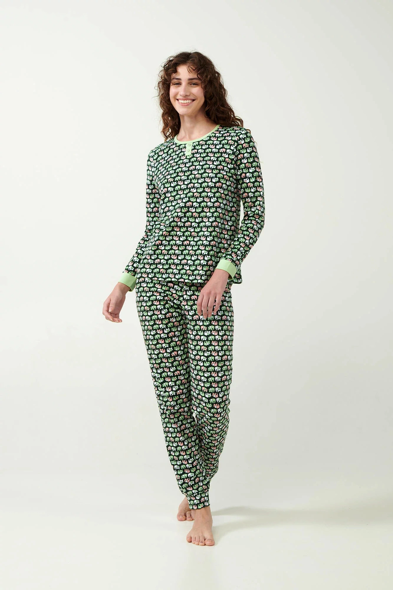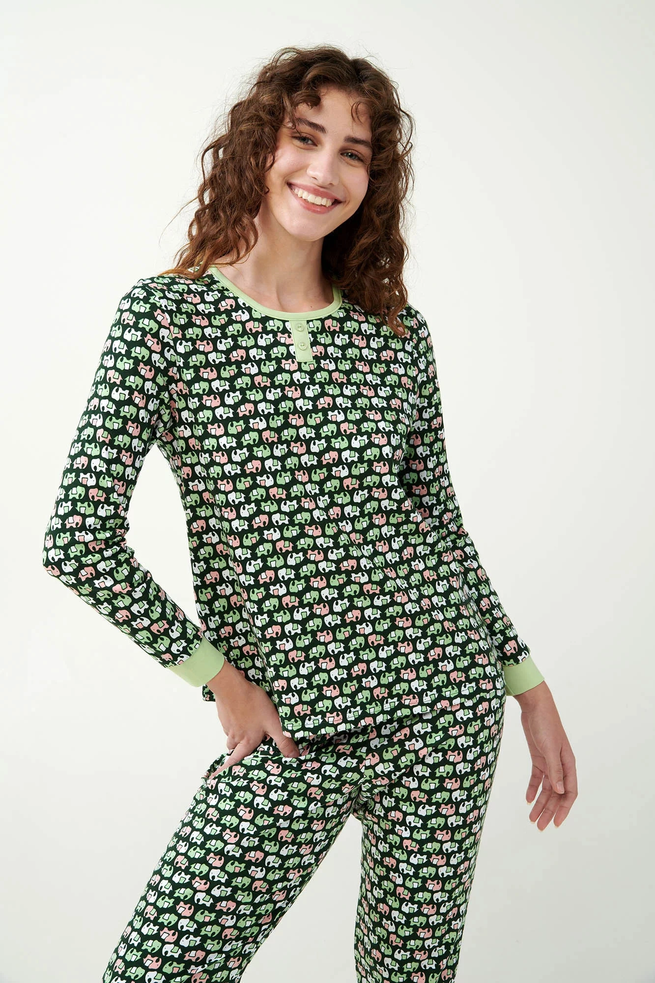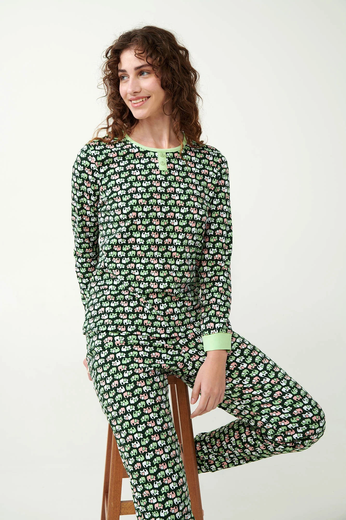 Vneste do svojho spacieho oblečenia nádych exotiky s naším pyžamom s potlačou indického slona. Toto pyžamo so žiarivým vzorom slona v sýtom smaragdovom základe je vyrobené zo 100 % bavlny interlock, ktorá zaručuje vynikajúcu mäkkosť a odolnosť. Súprava obsahuje vrchný diel s okrúhlym výstrihom, rukávy s manžetami a zodpovedajúce nohavice s manžetami, ktoré sú navrhnuté v regular strihu pre každodenné pohodlie. Toto pyžamo je ideálne na pohodlné noci alebo uvoľnené rána, spája hravý štýl s luxusným pohodlím.