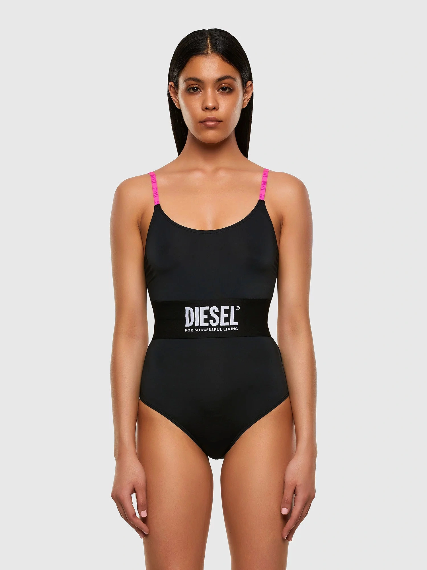 Trblietavé plavky s nízkym výstrihom vzadu a tenkými ramienkami. S nápisom Diesel cez hrudník. Mater