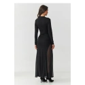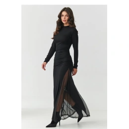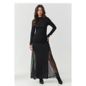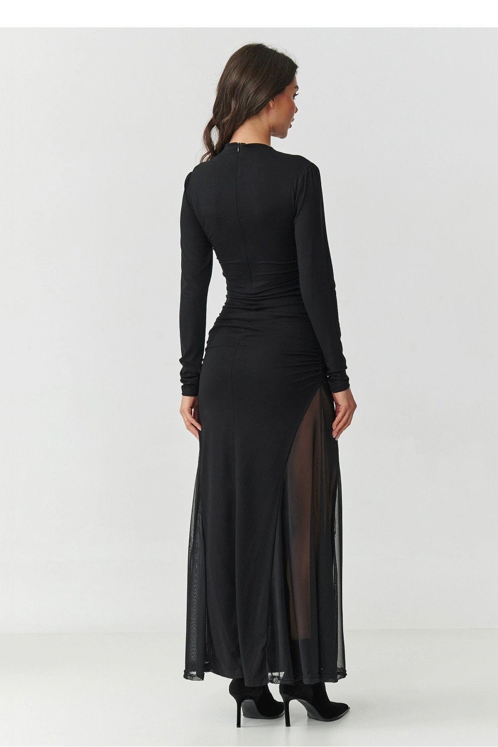 Objevte neuvěřitelně ženské a elegantní maxi šaty, vytvořené pro ženy, které oceňují klasiku s nádechem smyslnosti. Přizpůsobený střih krásně zdůrazňuje postavu, vystavujíce ženské tvary jemným, ale výrazným způsobem. Hluboké a průhledné vložky z tylu po stranách dodávají celému outfitu lehkost a sex appeal a výjimečný charakter. Zakrytý, klasický výstřih je poklonou nadčasové eleganci, vyvažuje odvážnější prvky šatů a dokonale zdůrazňuje linii krku a ramen. Právě tento kontrast dělá celkový dojem stylovým, elegantním a trochou tajemným. Na zádech šatů je diskrétní, skrytý zip, který zajišťuje pohodlné oblékání a perfektní přizpůsobení postavě. Jedná se o praktické řešení, které neodvádí pozornost od efektního střihu, a zároveň zajišťuje pohodlí nošení. Šaty jsou k dostání pouze v klasické, nadčasové černé barvě, která zdůrazňuje jejich eleganci a univerzální charakter. Jedná se o odstín, který