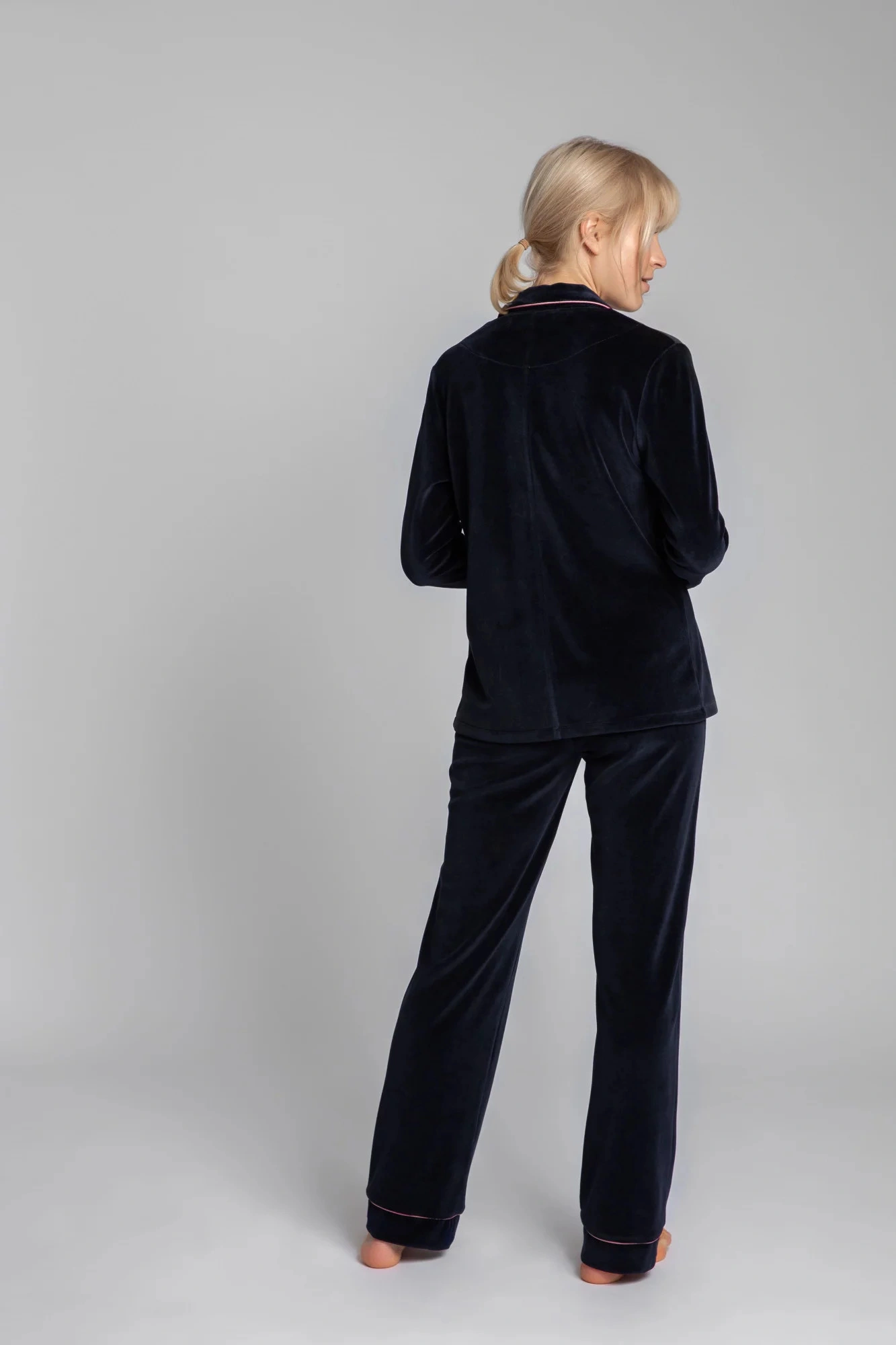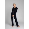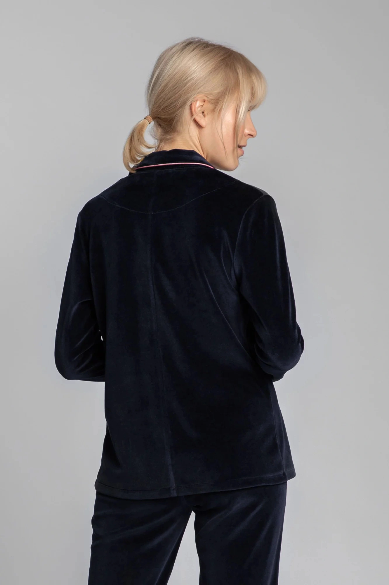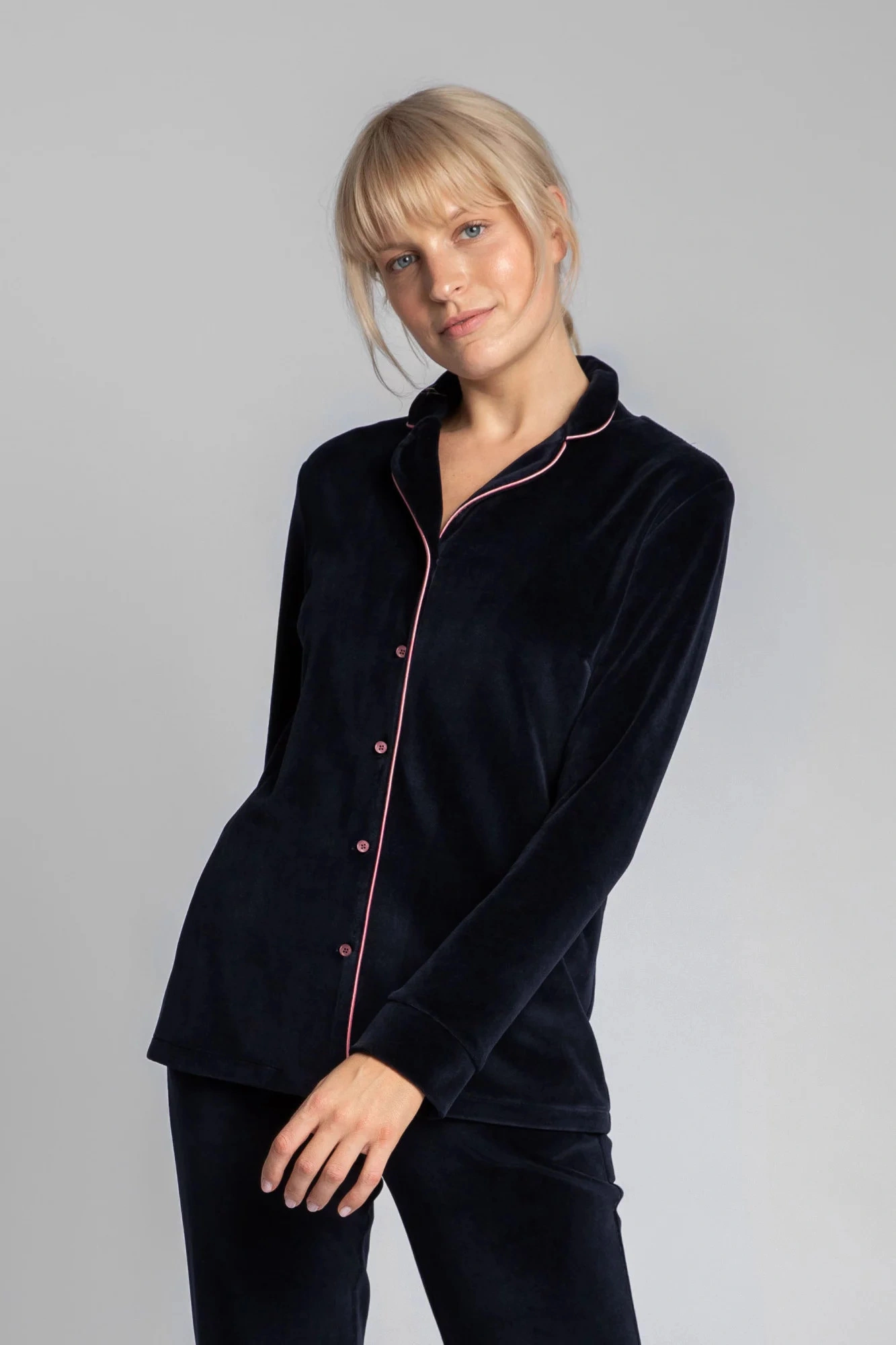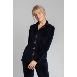 Luxusný zamatový pyžamový top s gombíkmi, vrúbkovaným golierom a ozdobným lemovaním pre lepší vzhľad. Košeľu najlepšie skombinujete s našimi zamatovými pyžamovými nohavicami s ozdobným lemovaním.