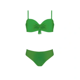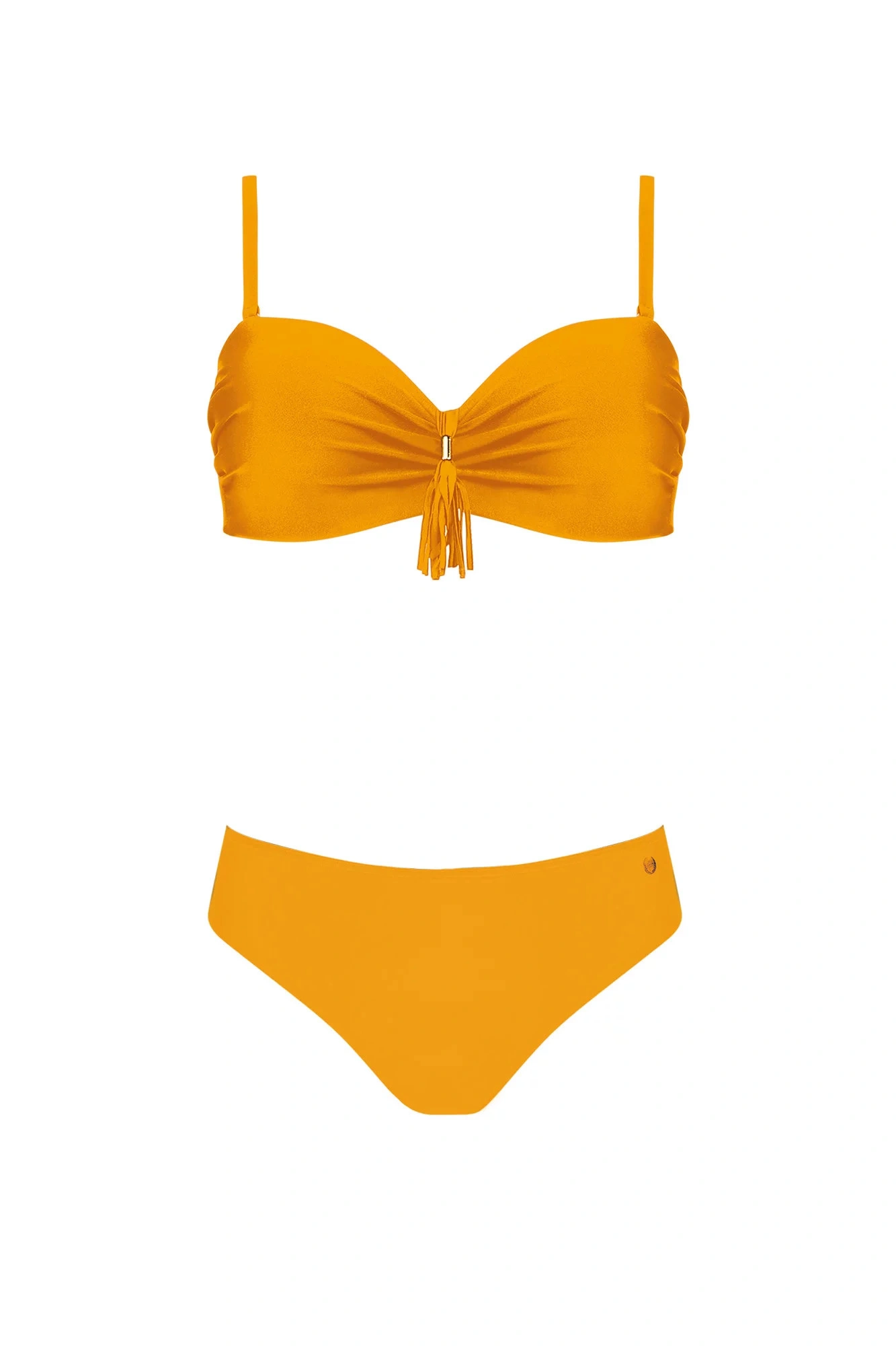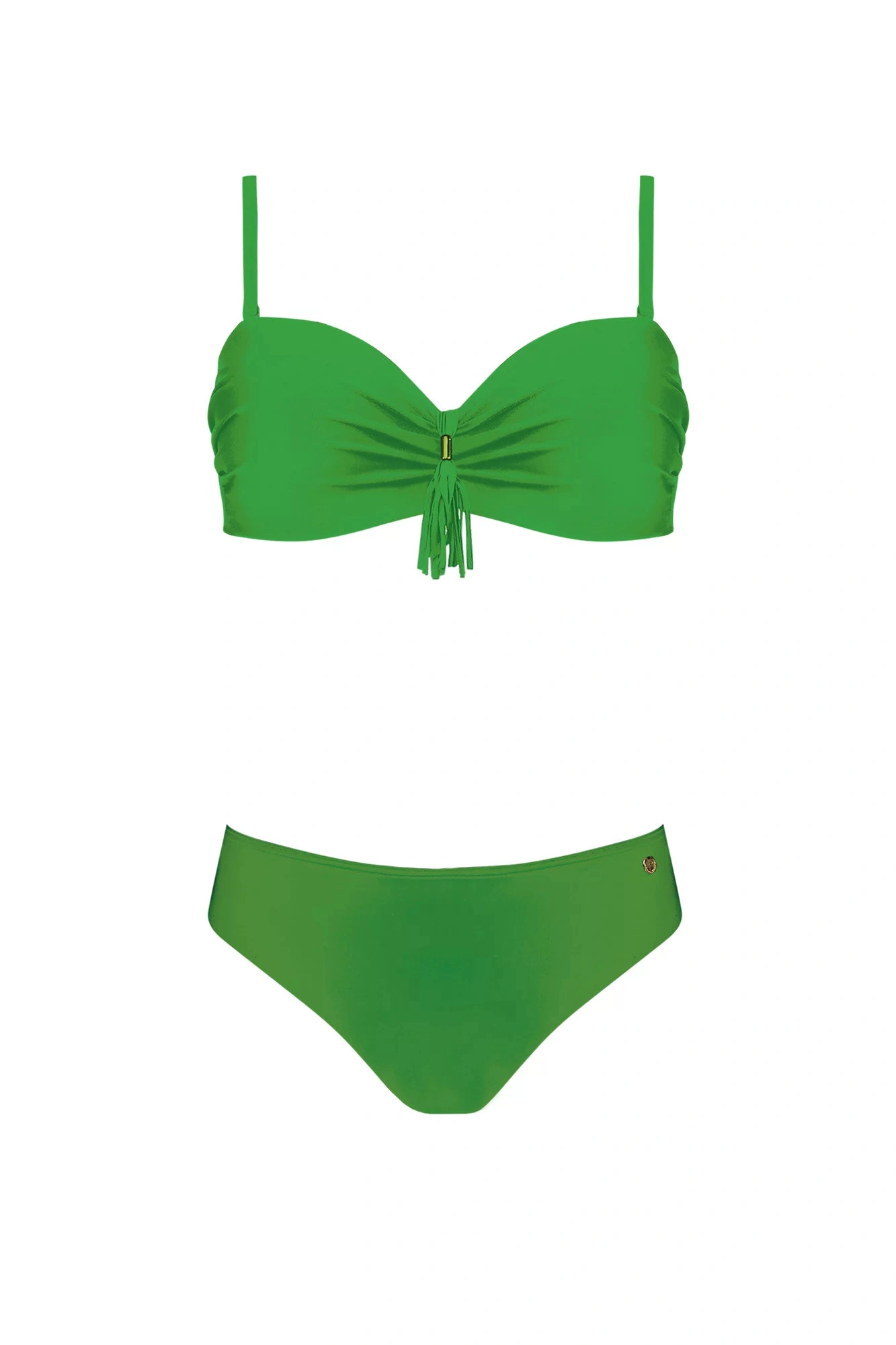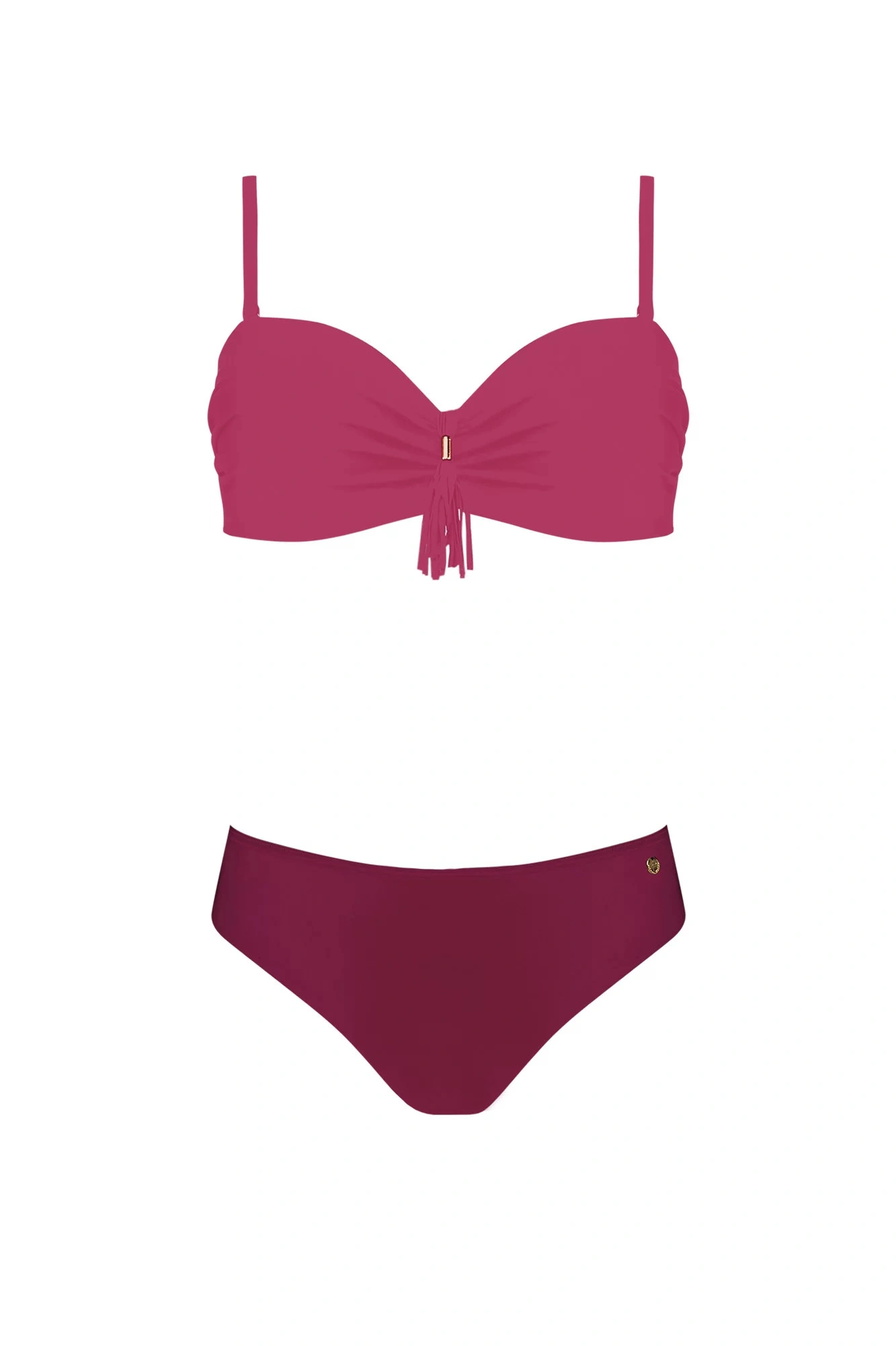 Dámske dvojdielne plavky Monako 5, vystužený vrchný diel, kostice, balkónový strih. Ozdobný strapec medzi prsiami. Popruhy sú odnímateľné, aby sa dali posúvať.spodná časť klasického strihu.