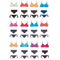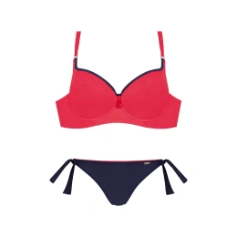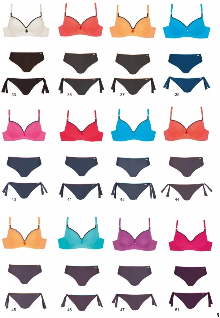 dvojdielne plavky s mäkkými penovými košíčkami a kosticami. Popruhy sú nastaviteľné. Kalhotky s hlbokým výstrihom sa zaväzujú na bokoch. V súprave je iná farba podprsenky a iné farby nohavičiek.