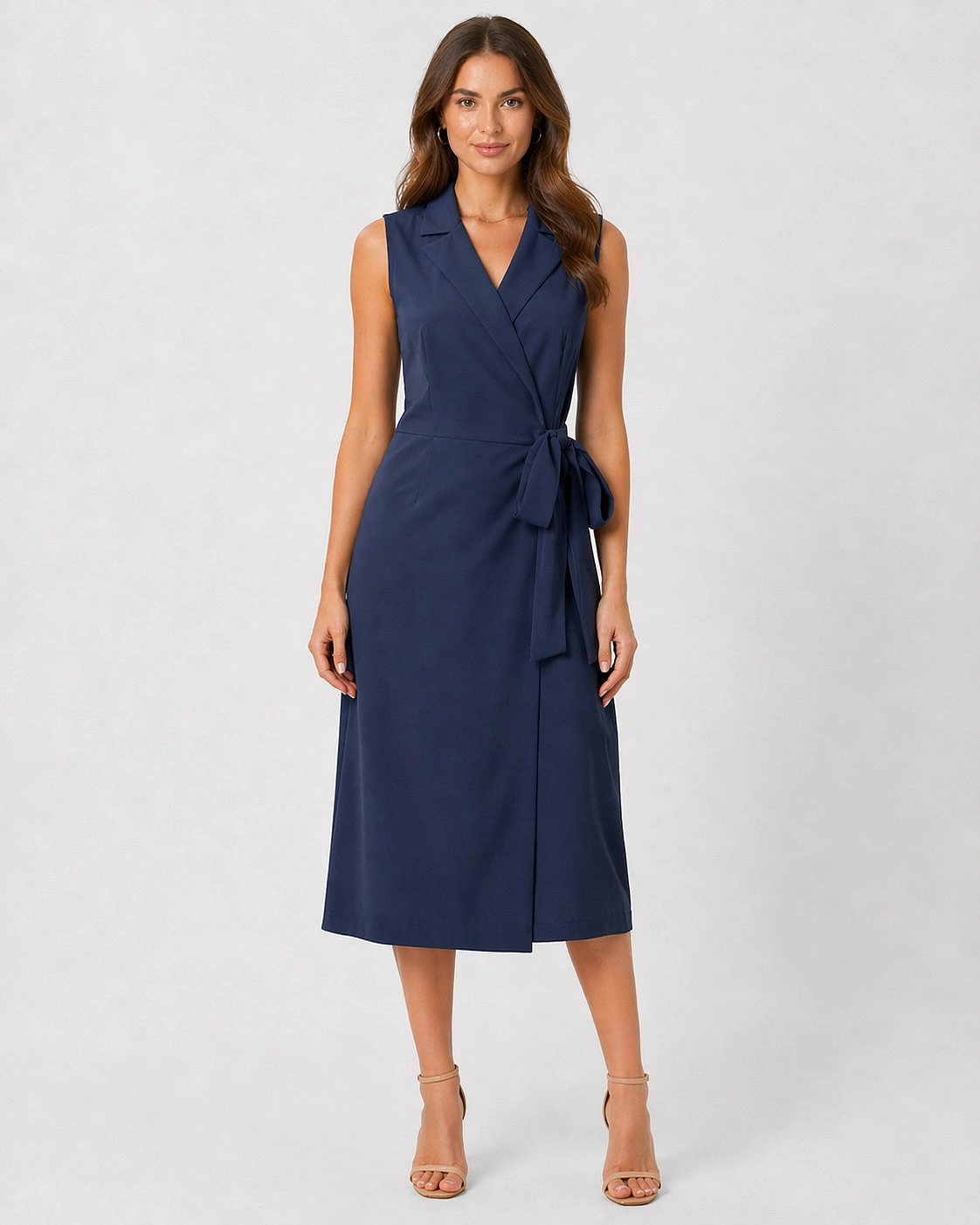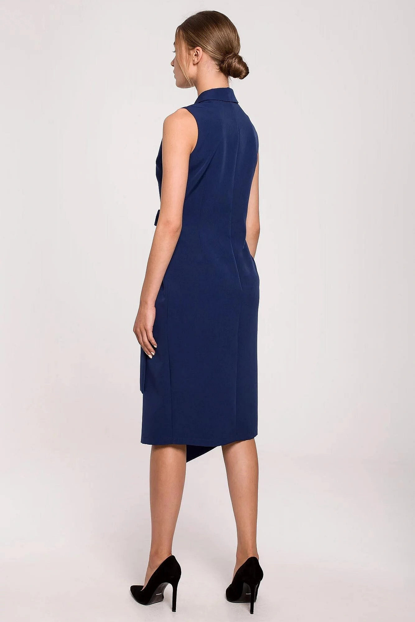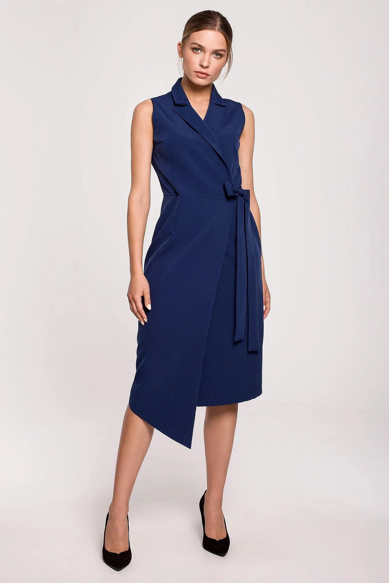 Tieto dámske midi šaty značky Stylove na prvý pohľad zaujmú elegantným strihom inšpirovaným sakom. Dizajn bez rukávov, výrazný golier s výstrihom do V a viazanie v páse vytvárajú ženskú siluetu, ktorá pôsobí upravene, moderne a veľmi vkusne. Midi dĺžka pod kolená dodáva modelu sofistikovaný vzhľad, vďaka čomu sú šaty ideálne do práce, na stretnutia, večierky a iné spoločenské príležitosti.