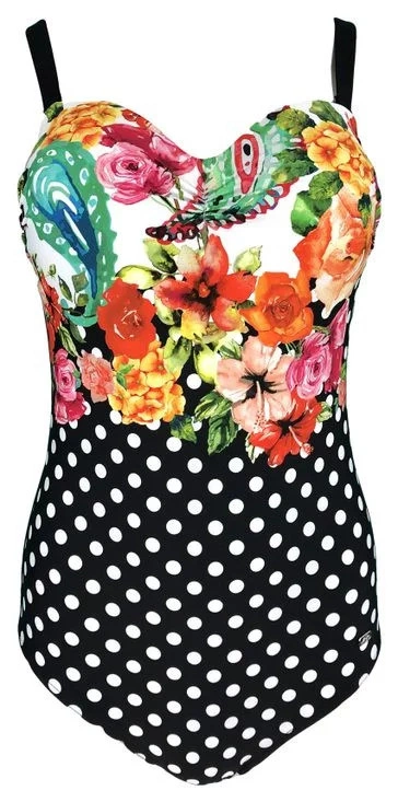 Dámske jednodielne plavky s potlačou kvetov a bodiek. Košíčky vystužené s podpornou gumou, bez kostíc. Posúvacie ramienka, vpredu odopínacie.