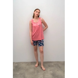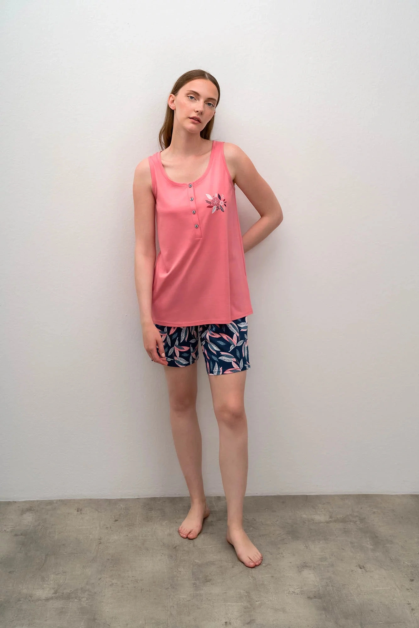 Dámske krátke pyžamo, vrchný diel jednofarebný s potlačou na hrudi, pri krku na gombíky, spodný diel farebný - listy