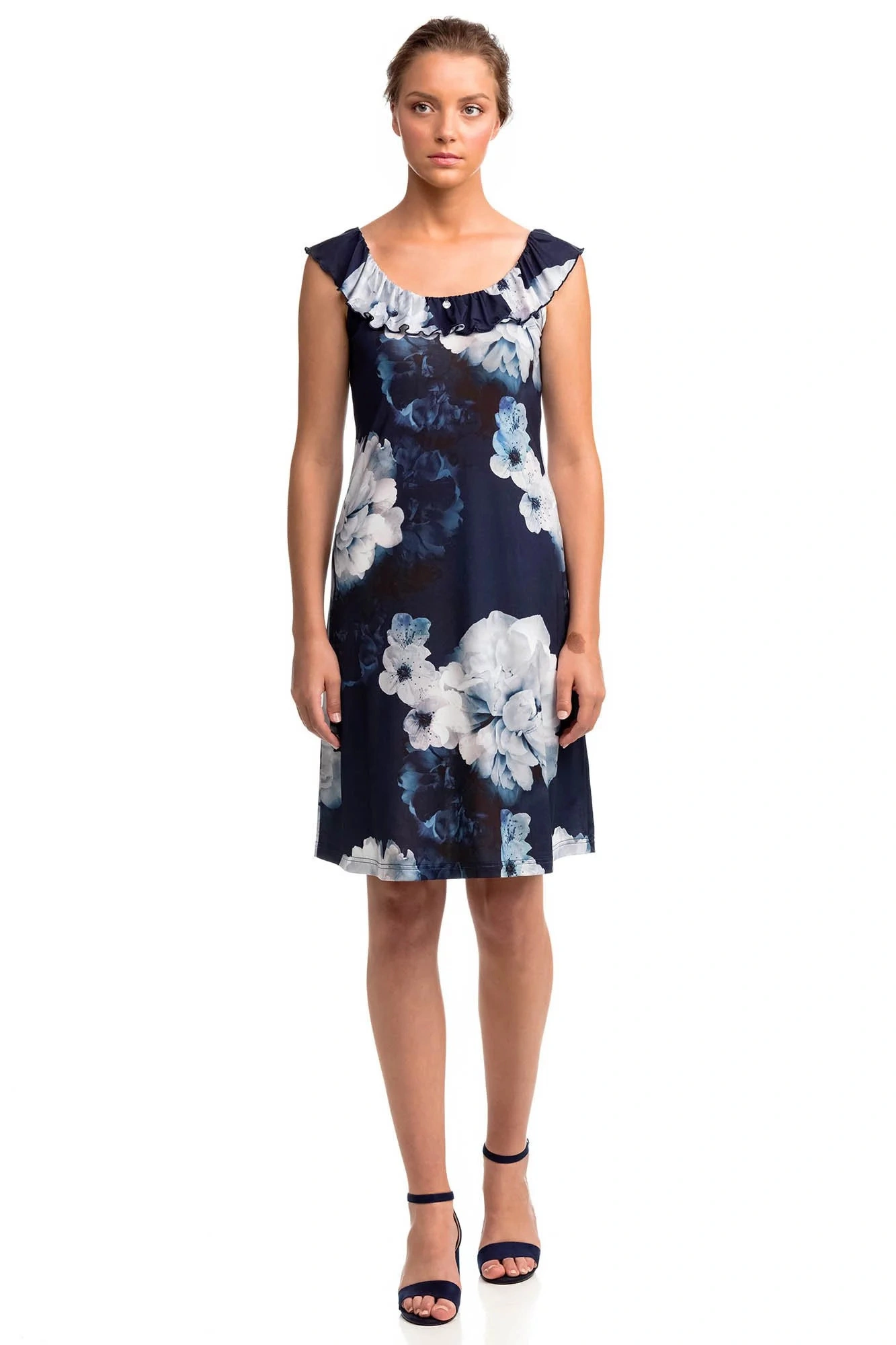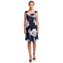 Elegantné dámske kvetinové šaty bez ramienok s okrúhlym výstrihom. Šaty sú vyrobené z príjemného džerseja-polyesteru s prímesou elastanu, ktorý zabezpečuje ľahkosť, priedušnosť, pružnosť a odolnosť.