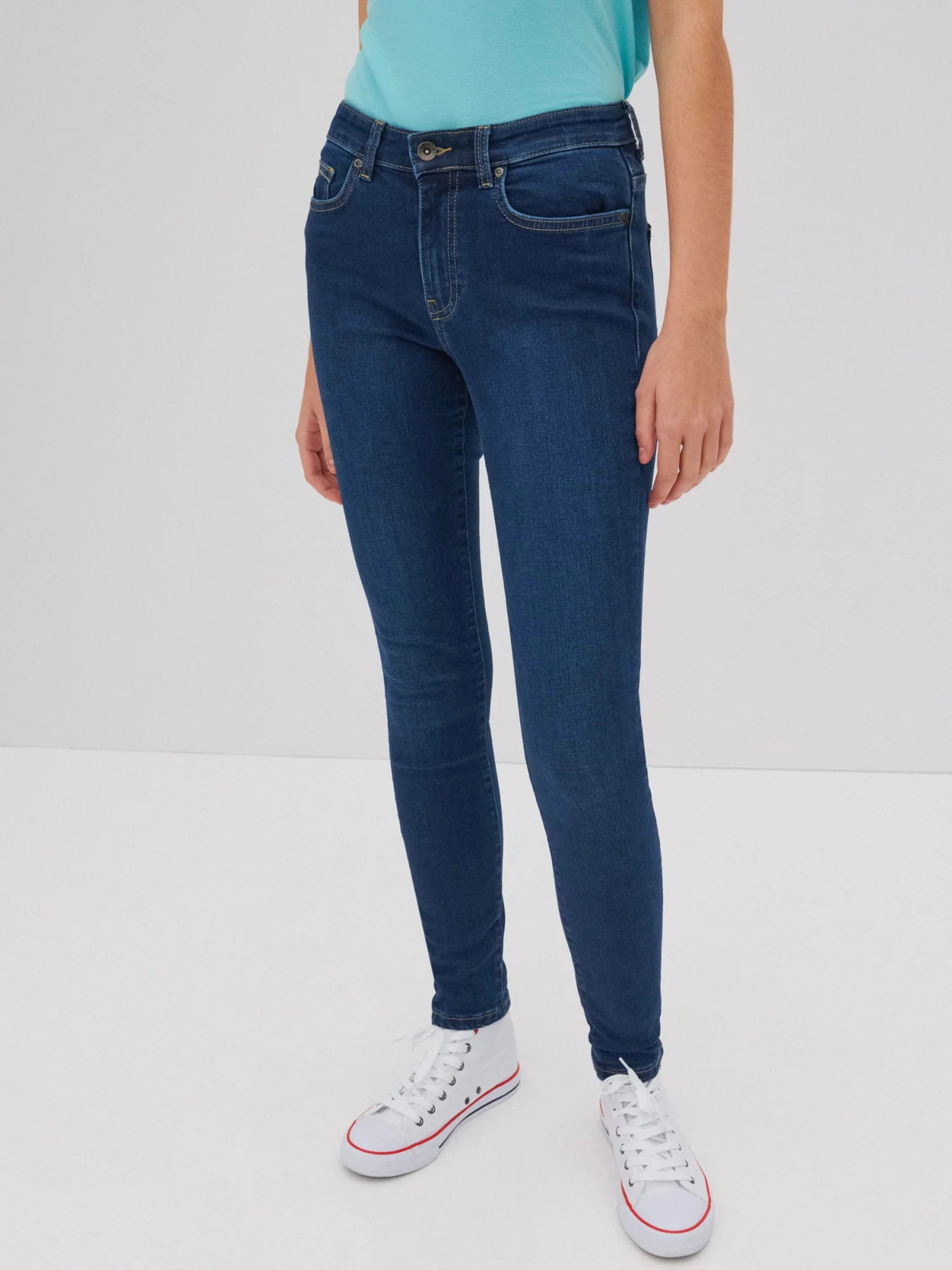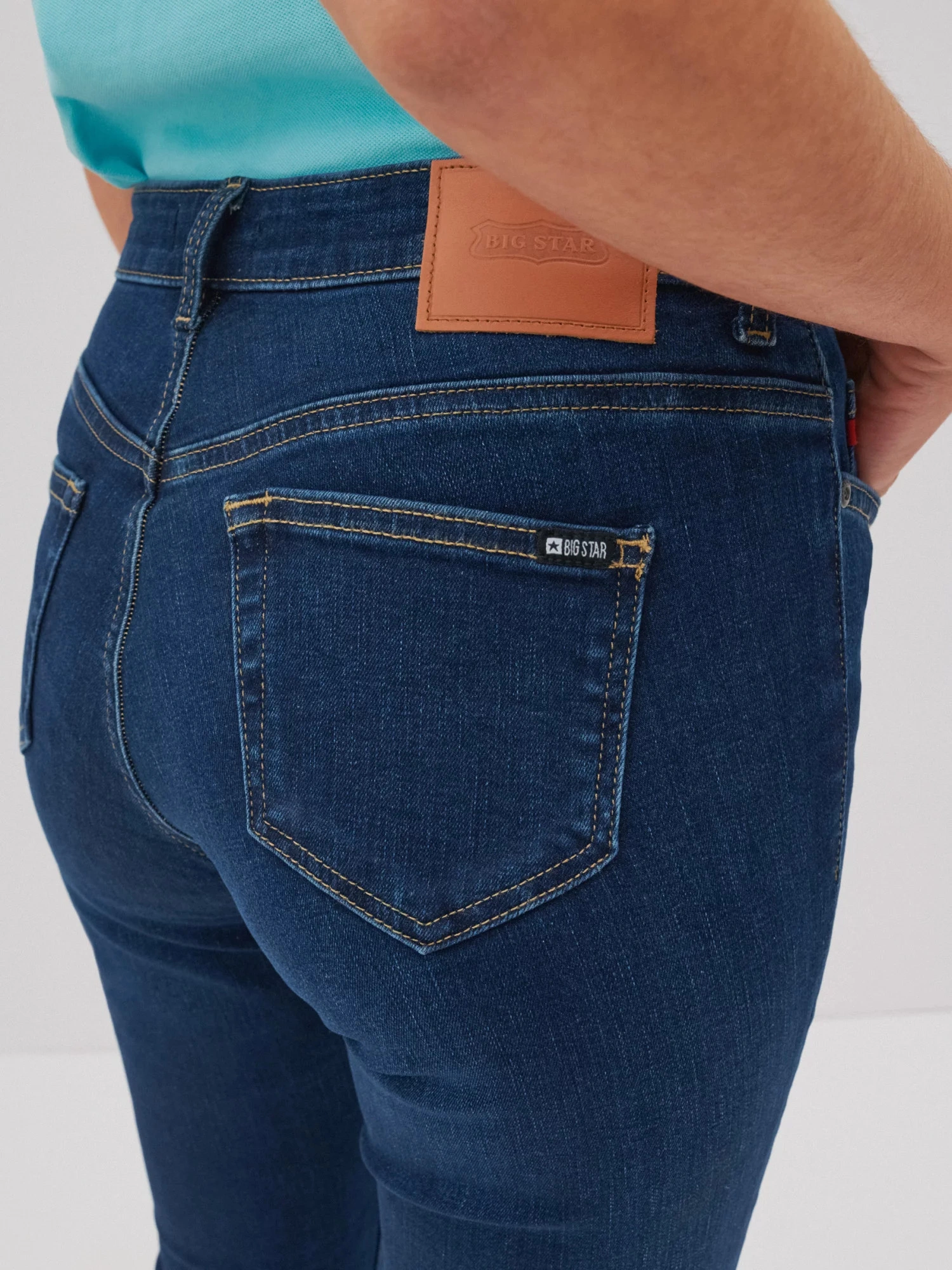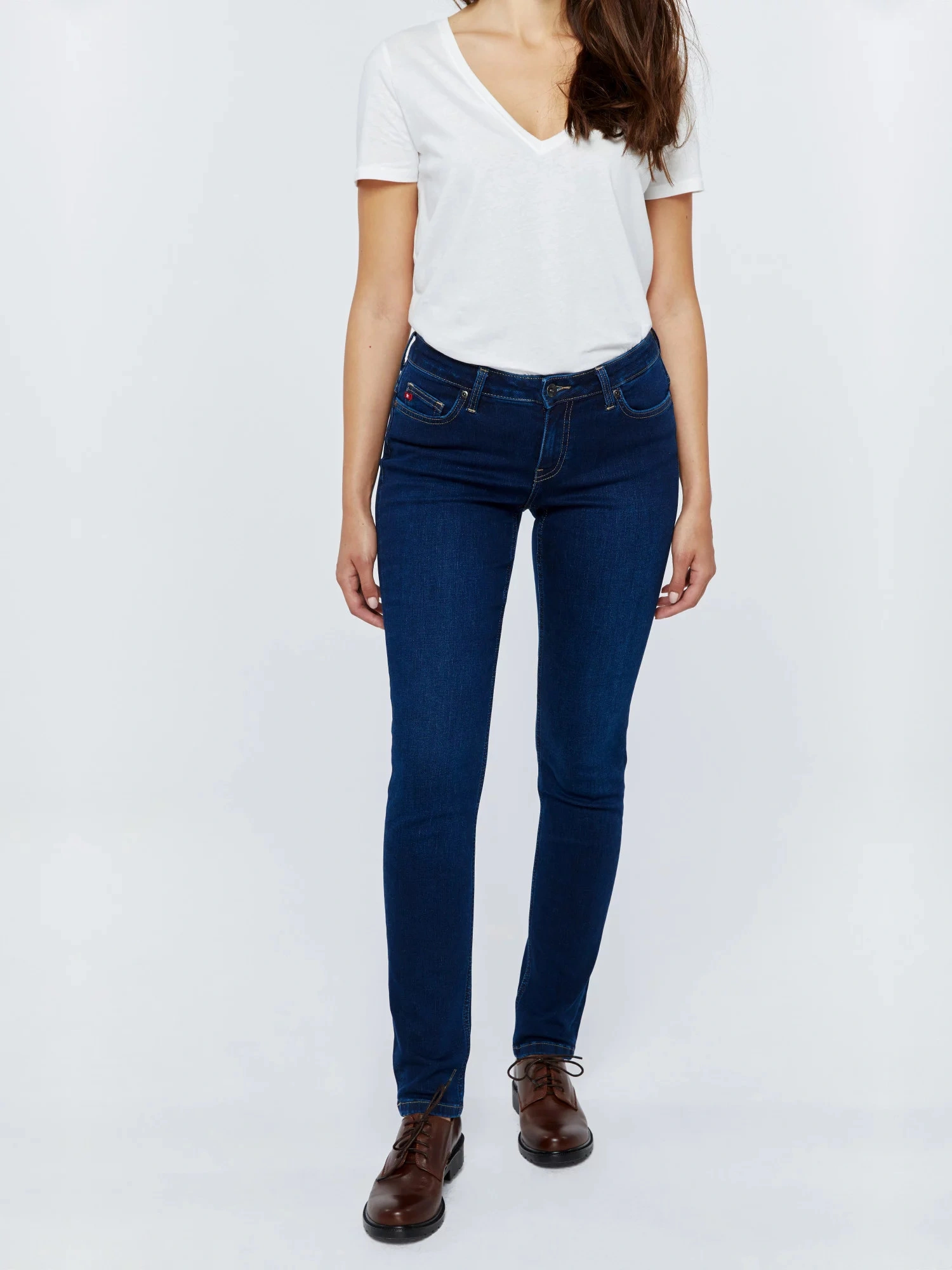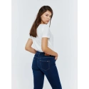 módny dizajn kriviek pre dokonale zvýraznenú siluetu vysoký pás, zúžené nohavice, päť vreciek, pútka na opasok, značková nášivka na zadnej strane priliehavý strih, pravidelný strih v páse