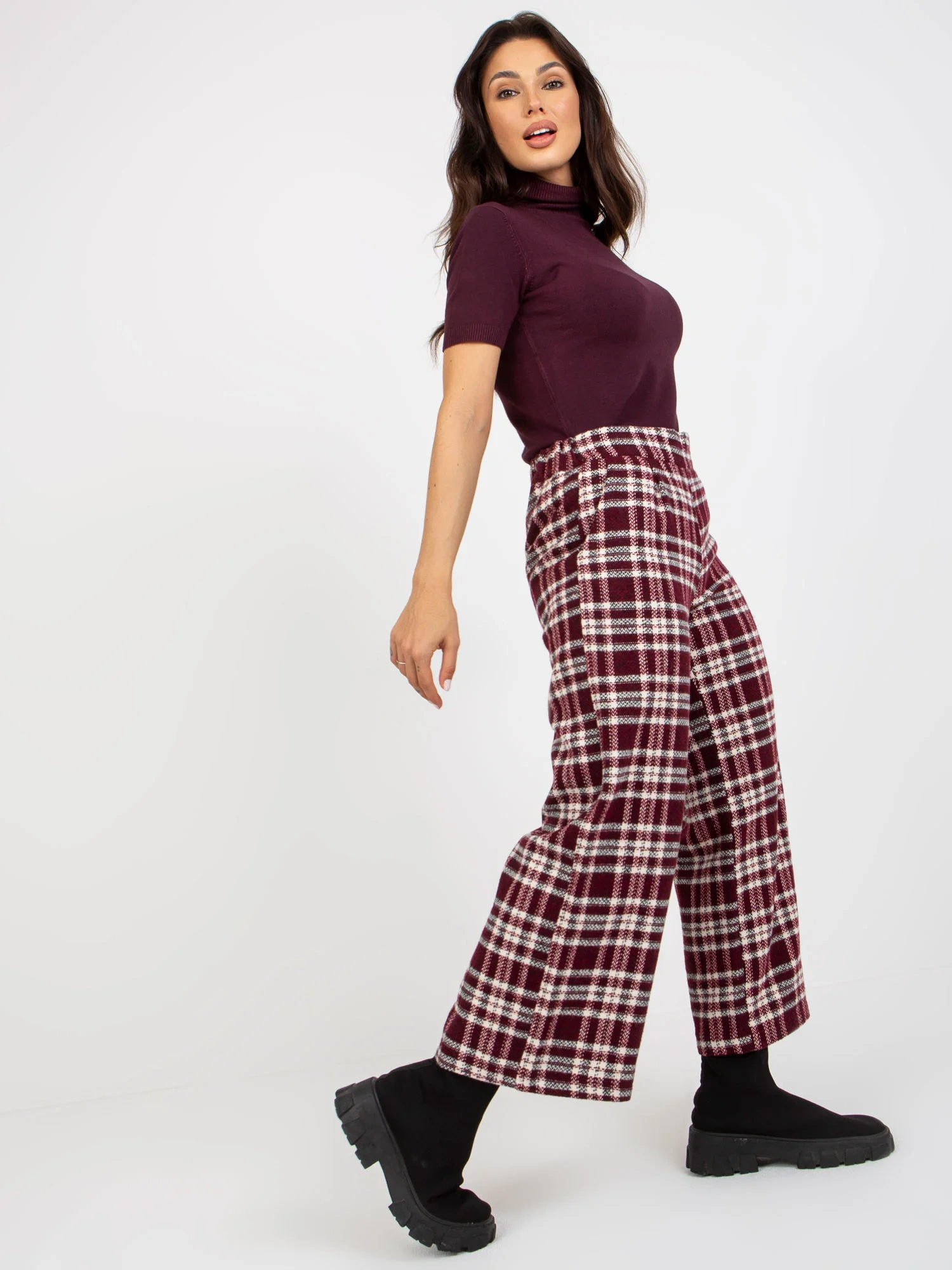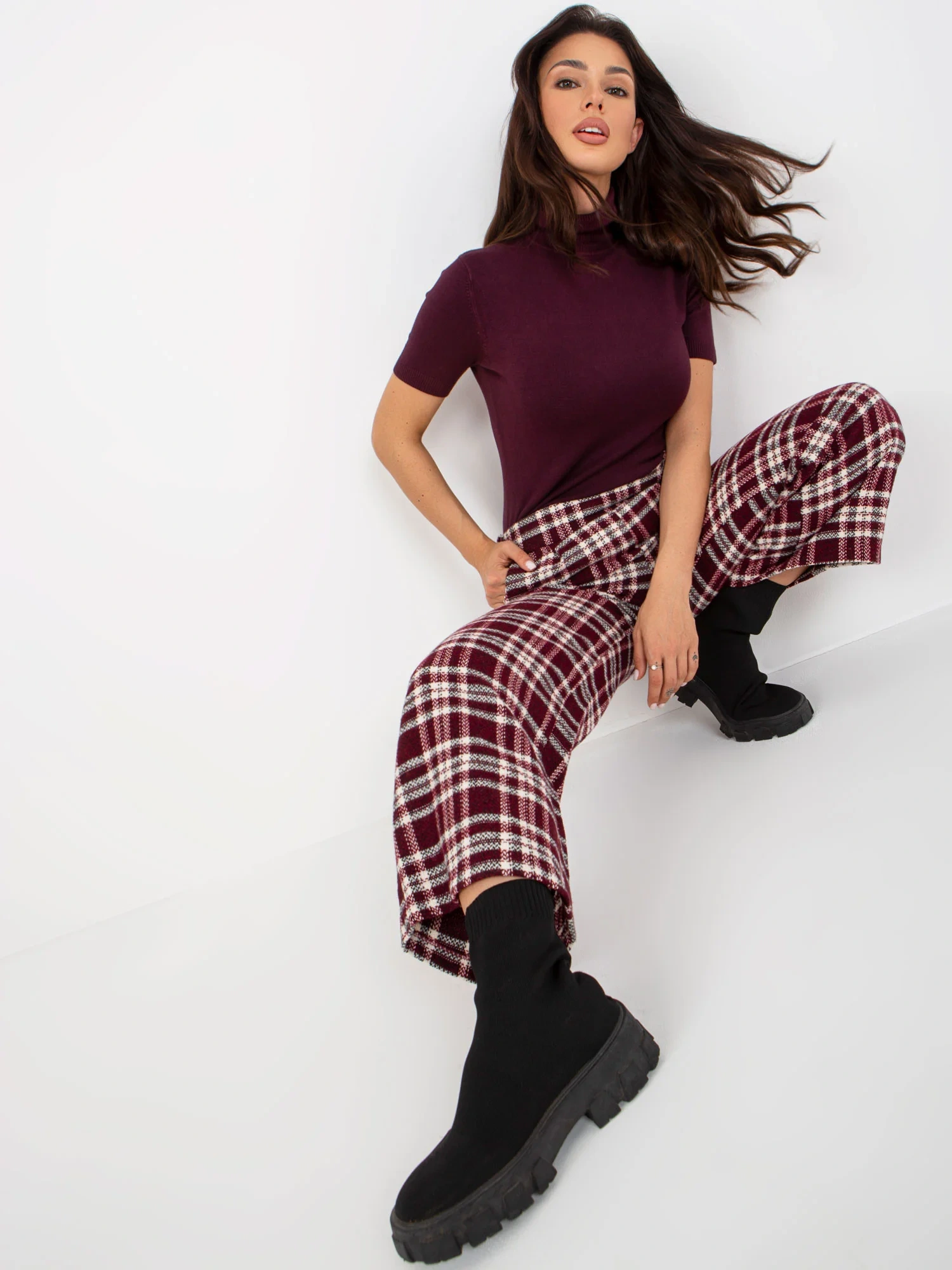 Modelka má na sebe veľkosť 36. Rozmery modelky: výška 164 cm, poprsie 86 cm, pás 67 cm, boky 99 cm.
