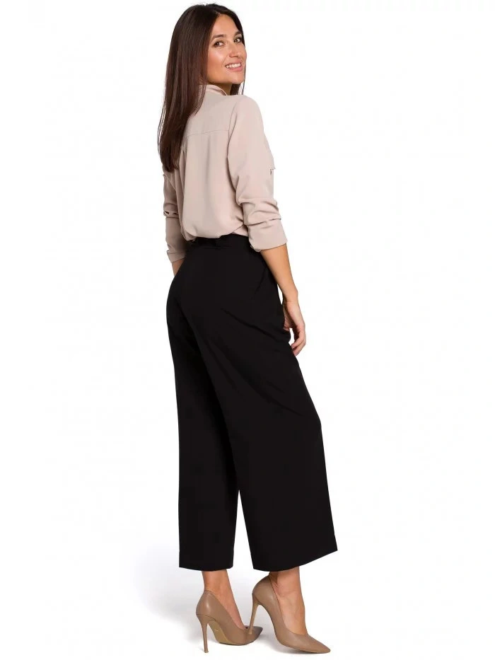 65% polyester 30% viskóza 5% elastan Urobte dojem s našimi plisovanými nohavicami so širokými nohavicami. Kombinujte ich s klasickými podpätkami, aby ste si mohli bez námahy vyraziť do spoločnosti, alebo s bielymi teniskami a tričkom, aby ste sa štylizovali aj mimo pracovného času. PODROBNOSTI O VÝROBKU: tkaný materiál široká riasená nohavica 7/8 dĺžka predného dielu, bočné vrecká bez podšívky dva gombíky a zapínanie na zips v prednej časti pútka na opasok naša modelka je vysoká 166 cm a nosí veľkosť S