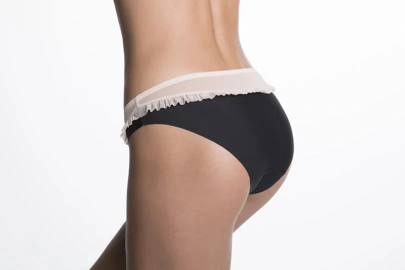 Nohavičky sú vyrobené z elastickej hladkej tkaniny. Okraje sú hladké, vyrobené technológiou INVISIBLE LINE. Nohavičky zdobí priehľadná sieťovaná vložka s volánom.