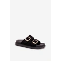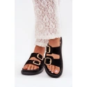 Dámske sandále z ekologického semišu. Umiestnené na platforme. Dva nastaviteľné remienky so zlatými prackami zabezpečia ideálne prispôsobenie a tvarovaná stielka zaručí pohodlie počas celého dňa. Ideálne na každodenné vychádzky.
