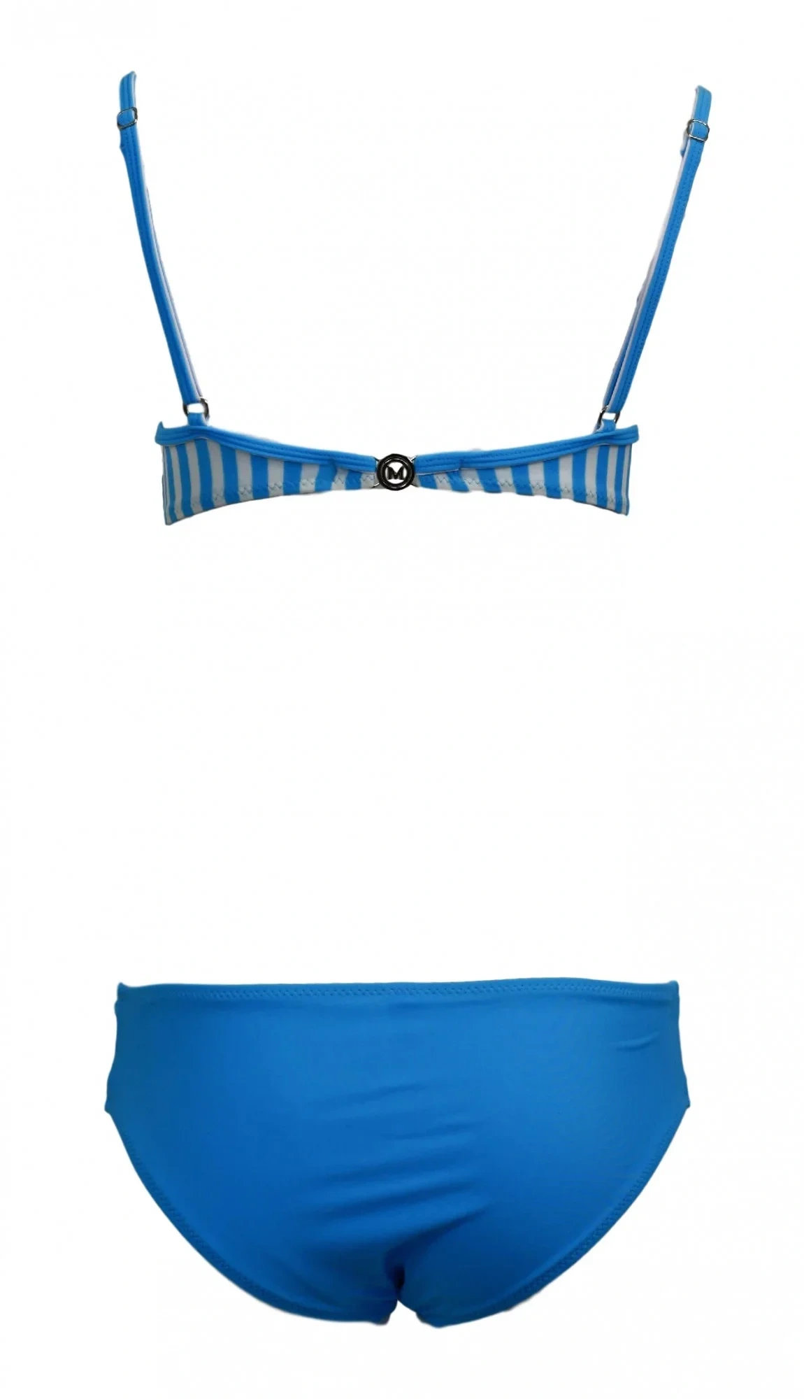 Dámske dvojdielne plavky krásnej modrej farby s aplikáciou. Vrchný diel vystužený, s kosticami. Hrub