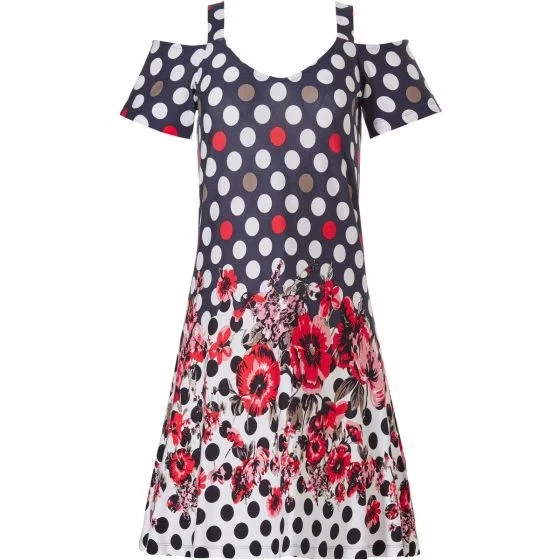 Pekný model plážových šiat pre dámy od značky Pastunette.šaty majú krátke rukávy a ramienka, takže ramená sú odhalené.veselý vzor - veľké bodky v červenej, bielej a sivej farbe na tmavomodrom pozadí.pod ním je rám z krásnych červených kvetov na bielom pozadí s čiernymi bodkami.pekné plážové šaty sú v spodnej časti o niečo širšie.