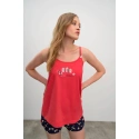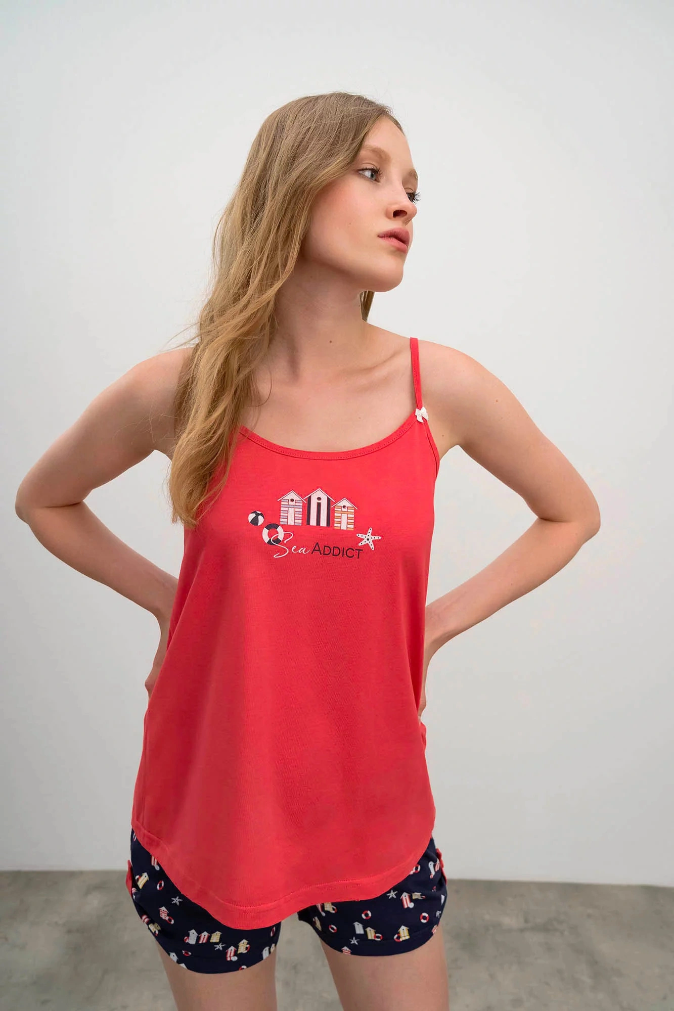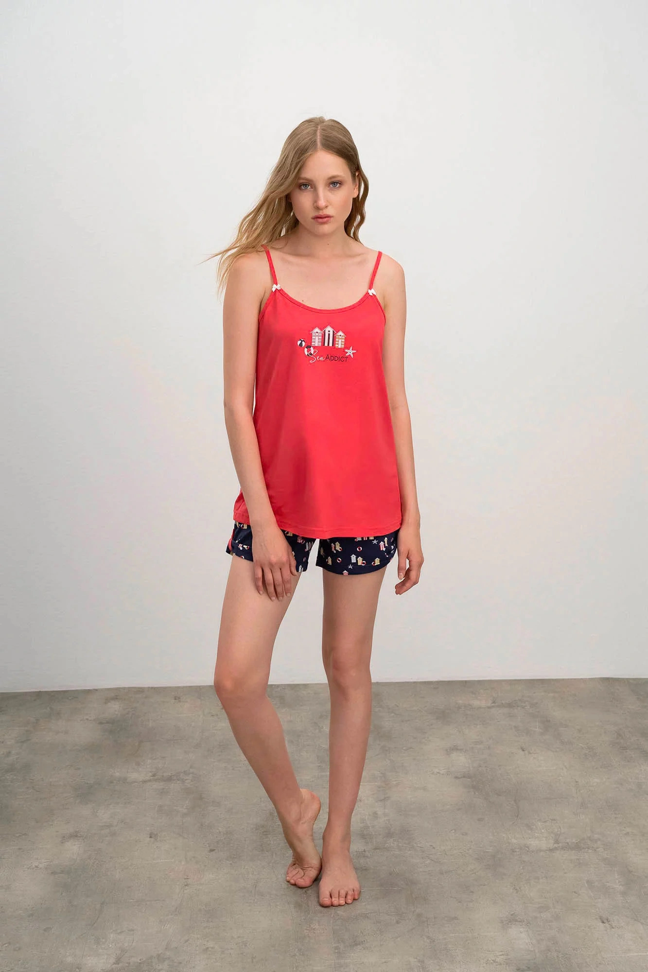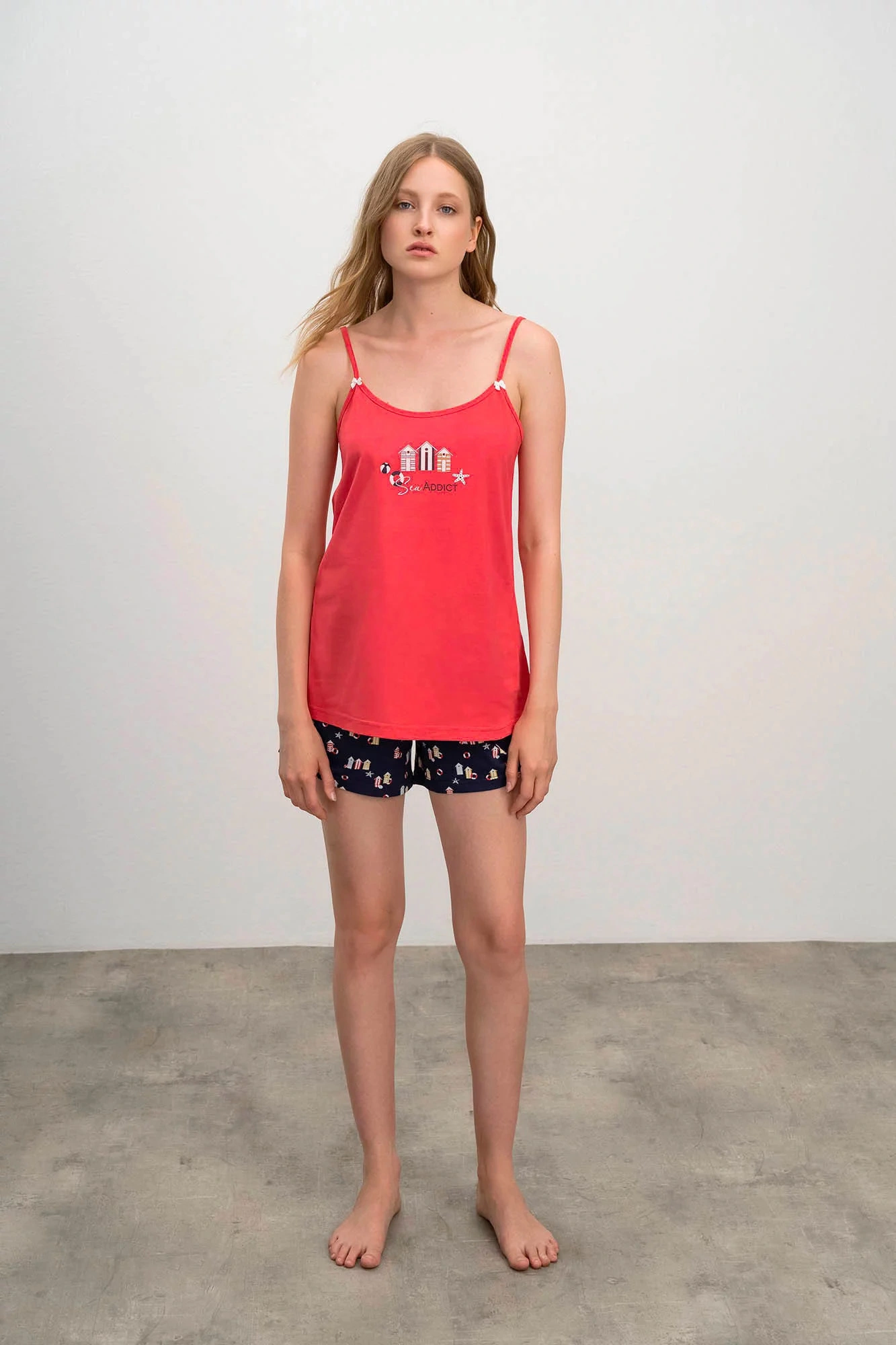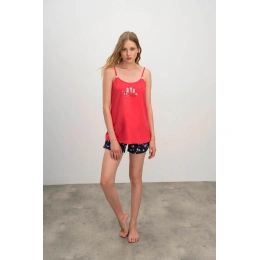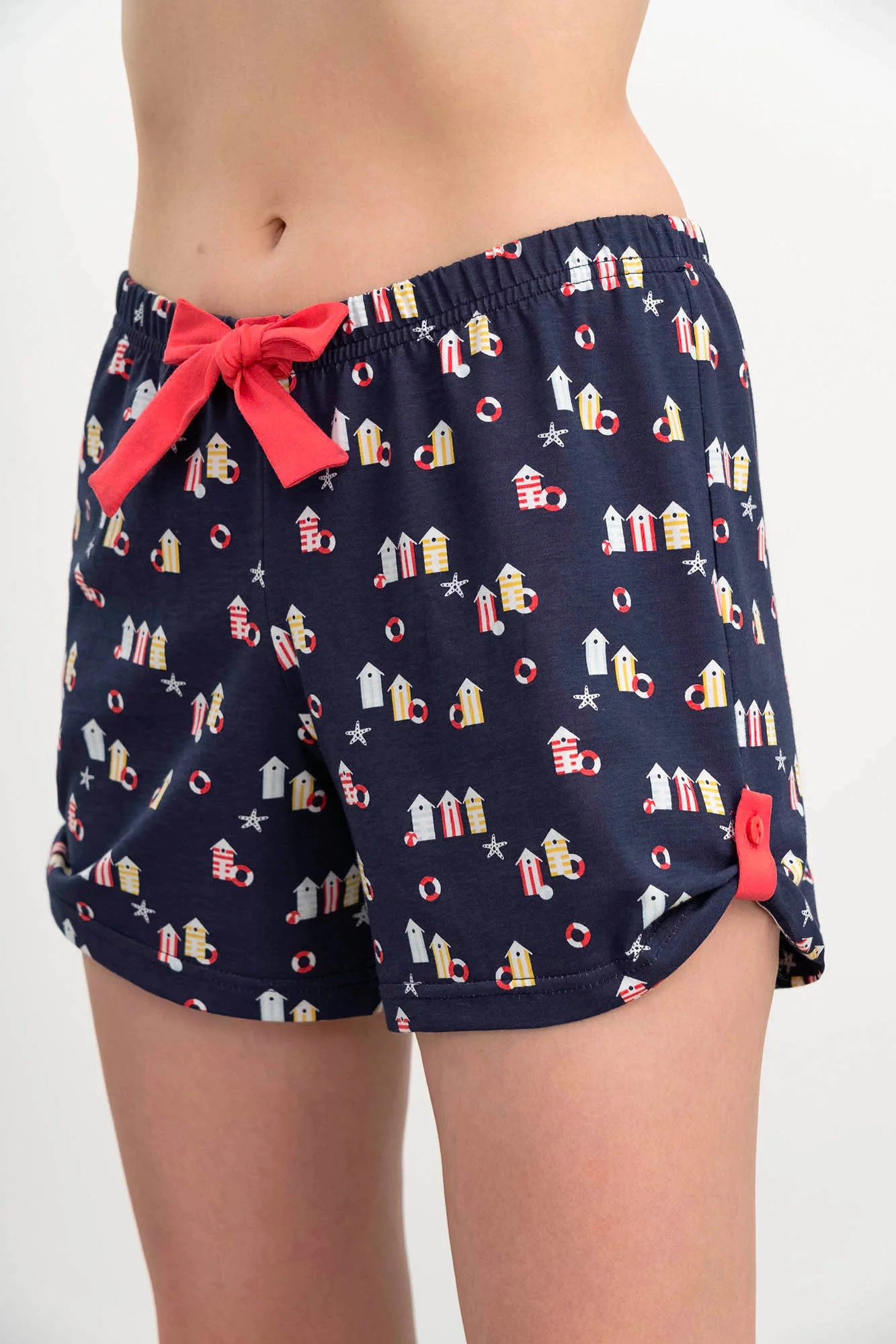 Dvojdielne dámske pyžamo na pohodlný spánok. Komplet pozostáva z jednofarebnej košieľky na ramienka s okrúhlym výstrihom, ktorý dopňujú krátke šortky s potlačou domčekov s pohodlnou gumou v páse. Pyžamo je vyrobené z vysoko kvalitnej, genetický nemodifikovanej gréckej bavlny, ktorá poskytuje vysoké pohodlie, príjemný pocit na dotyk, priedušnosť, pružnosť a odolnosť.