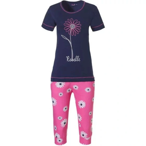 Dámske pyžamo s krátkym rukávom od značky Rebelle.na tmavomodrej vrchnej strane je obrázok sedmokrásky a text - Rebelle -.polodlhé pyžamové nohavice sú ružové s potlačou sedmokrások.