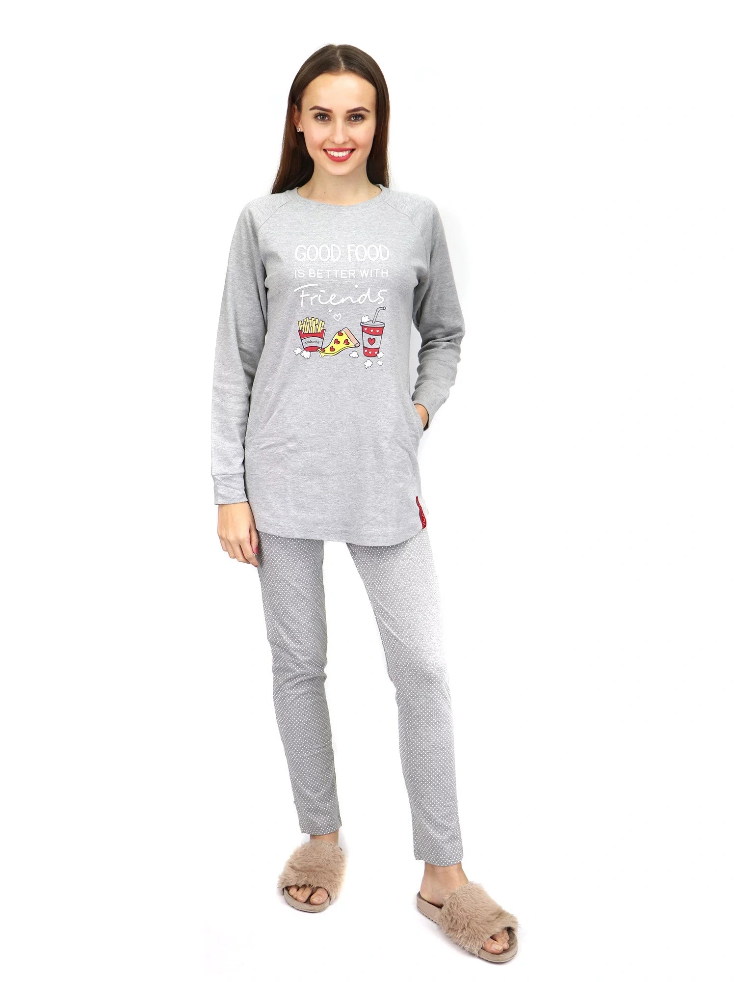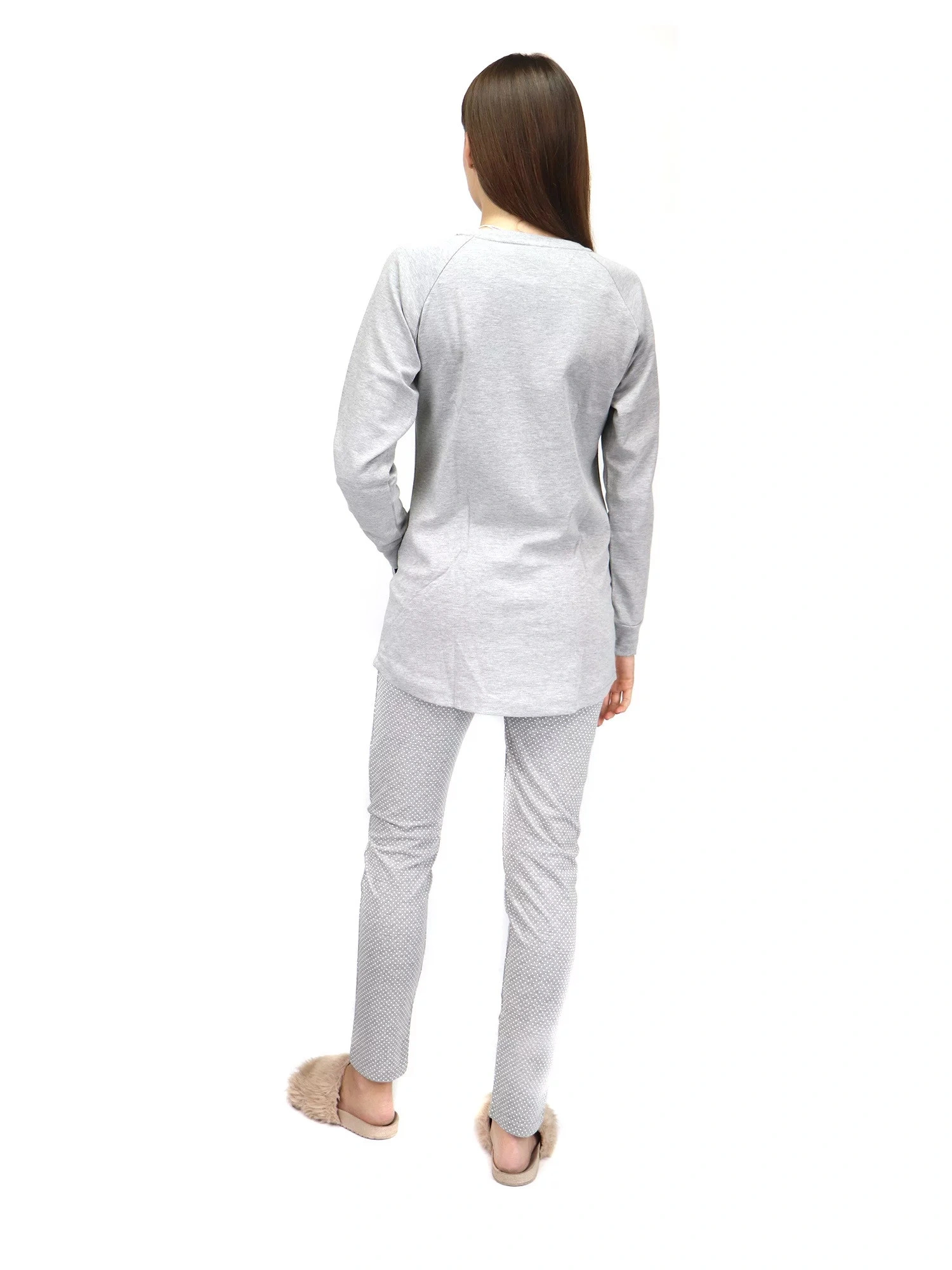 Dámske huňaté pyžamo, dlhé nohavice, dlhé rukávy. Nohavice v páse na gumu. Vrchný diel s okrúhlym vý