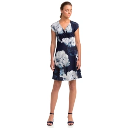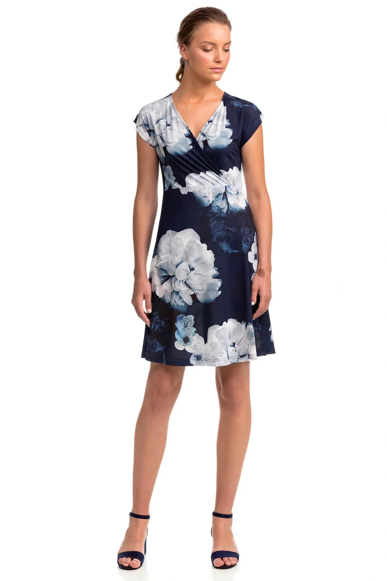 Elegantné dámske kvetované šaty s krátkym rukávom a prekladaným výstrihom do V. Šaty sú vyrobené z príjemného jersey-polyesteru s prímesou elastanu, ktoré poskytujú ľahkosť, priedušnosť, pružnosť i odolnosť.
