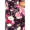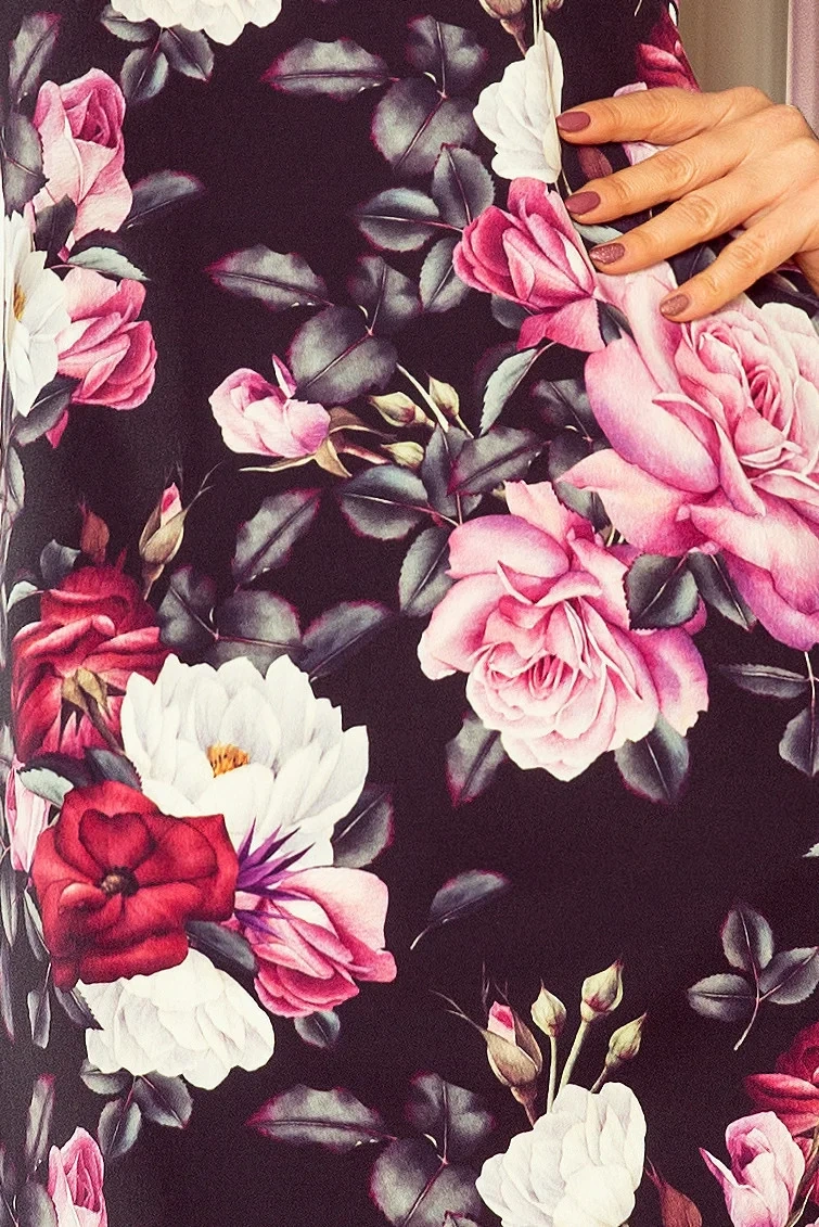 Dámske šaty na denné nosenie s 3/4 volánovými rukávmi so zaväzovaním. Šaty majú jednoduchý strih a zaujímavý kvetinový vzor. Model má dĺžku nad kolená a decentný okrúhly výstrih. Hodia sa na bežné denné nosenie do práce, do mesta, ale aj na spoločenské udalosti, ako je svadba, banket a podobne zamerané podujatia. Šaty sú vyrobené z príjemného materiálu a pohodlne sa nosia.