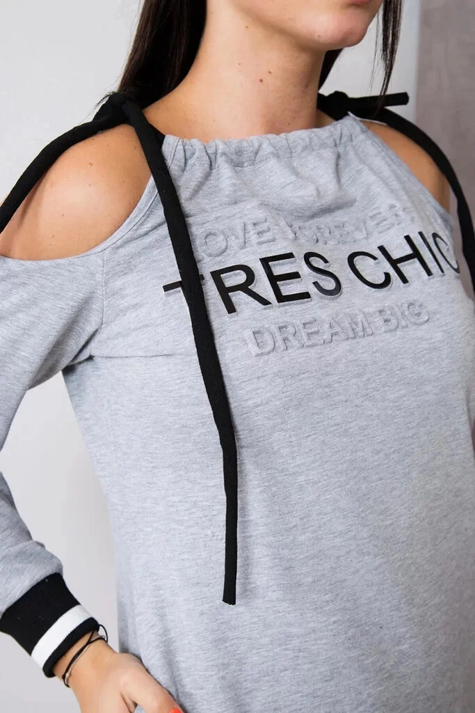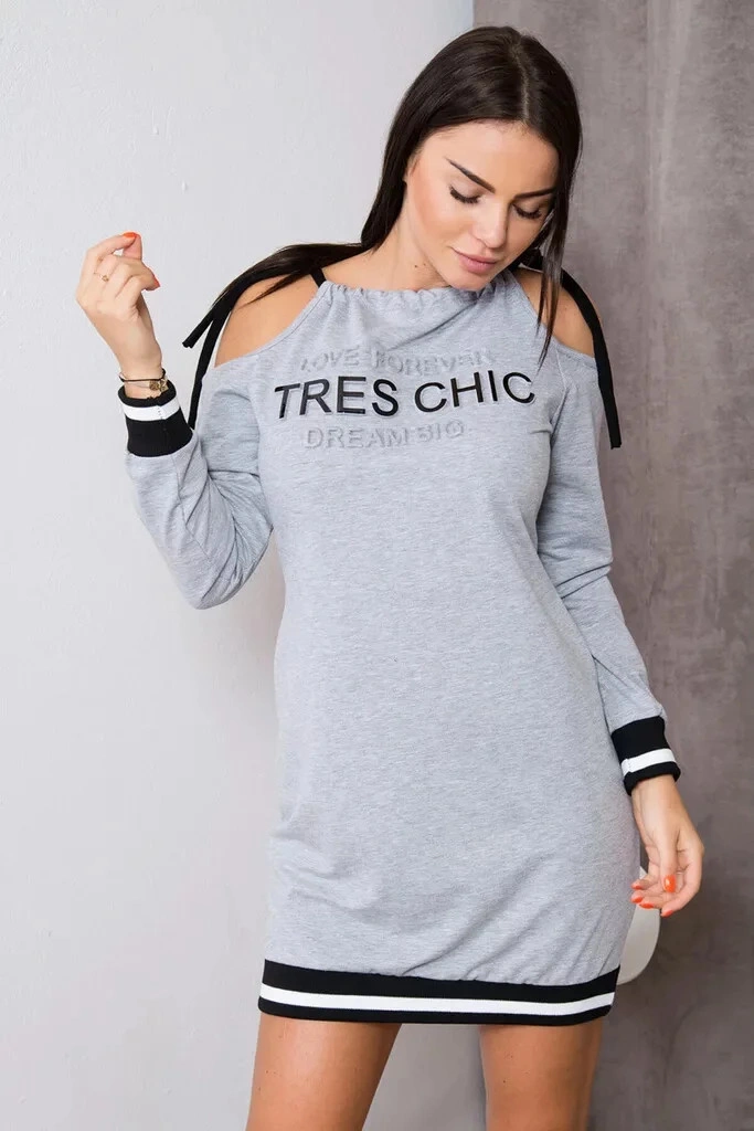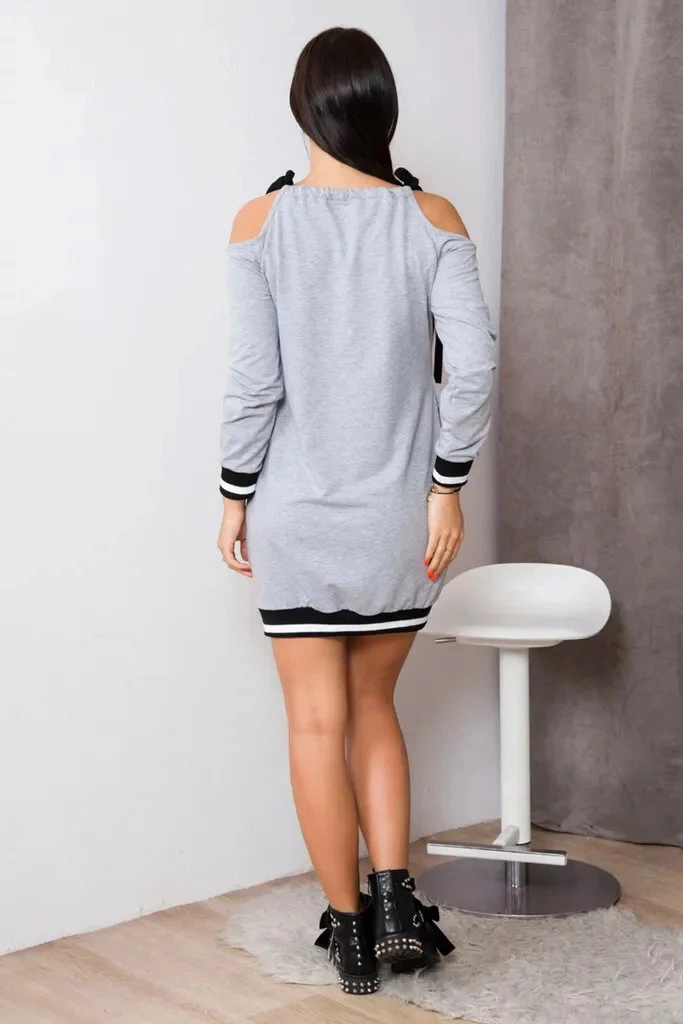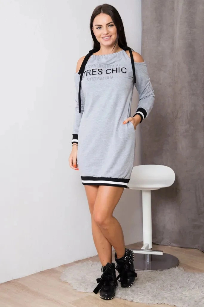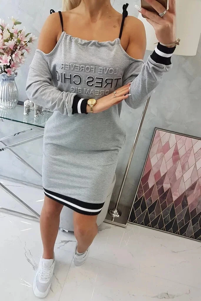 Dámske ležérne šaty s reliéfnym nápisom, odhalenými ramenami a šnúrkou na zaväzovanie. Vhodné pre veľkosť. S, M a L.