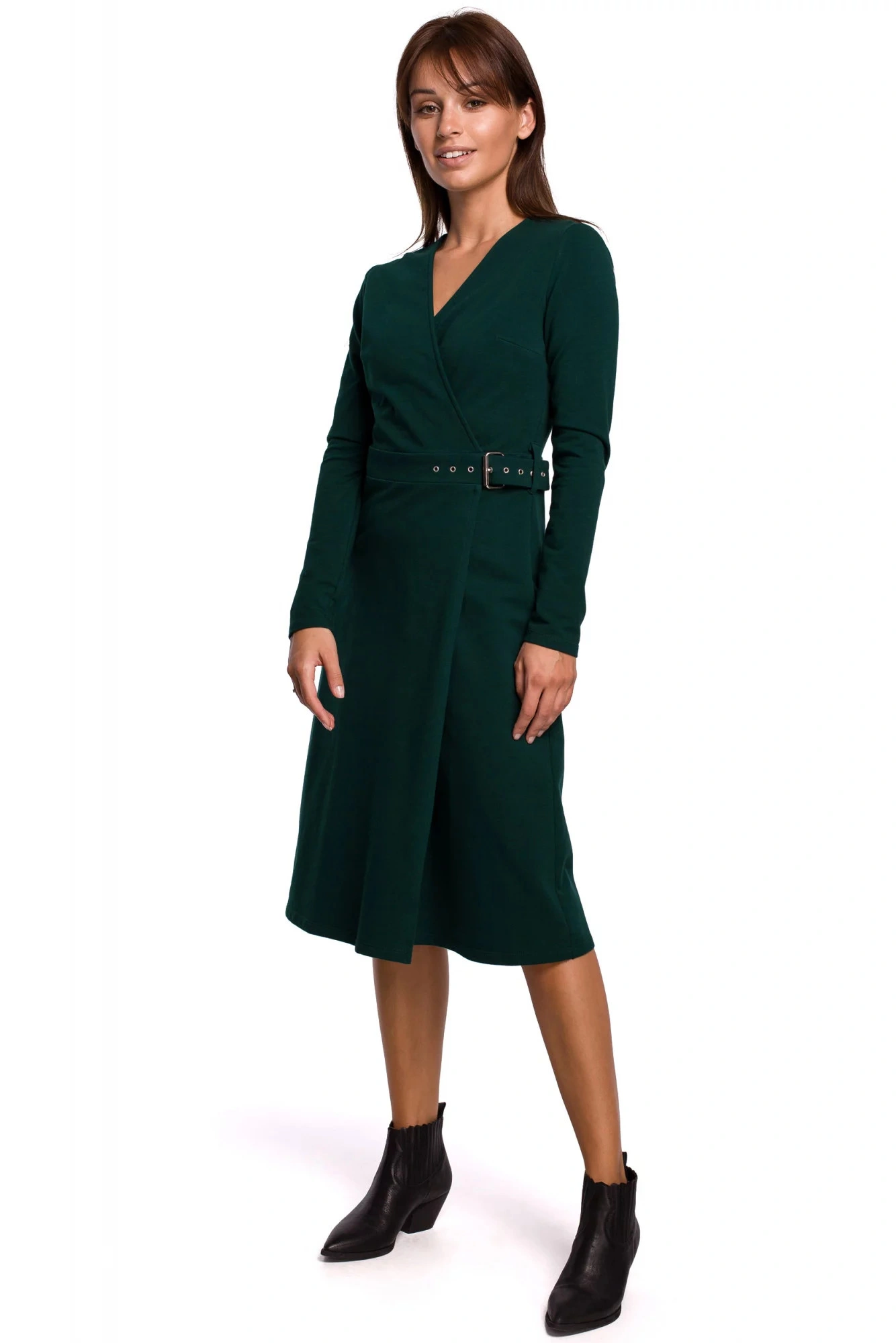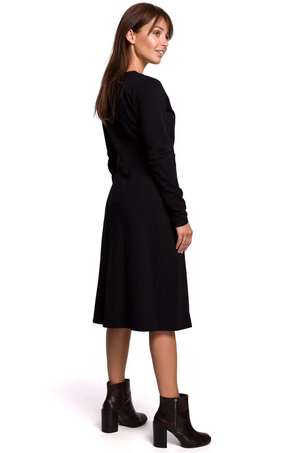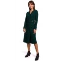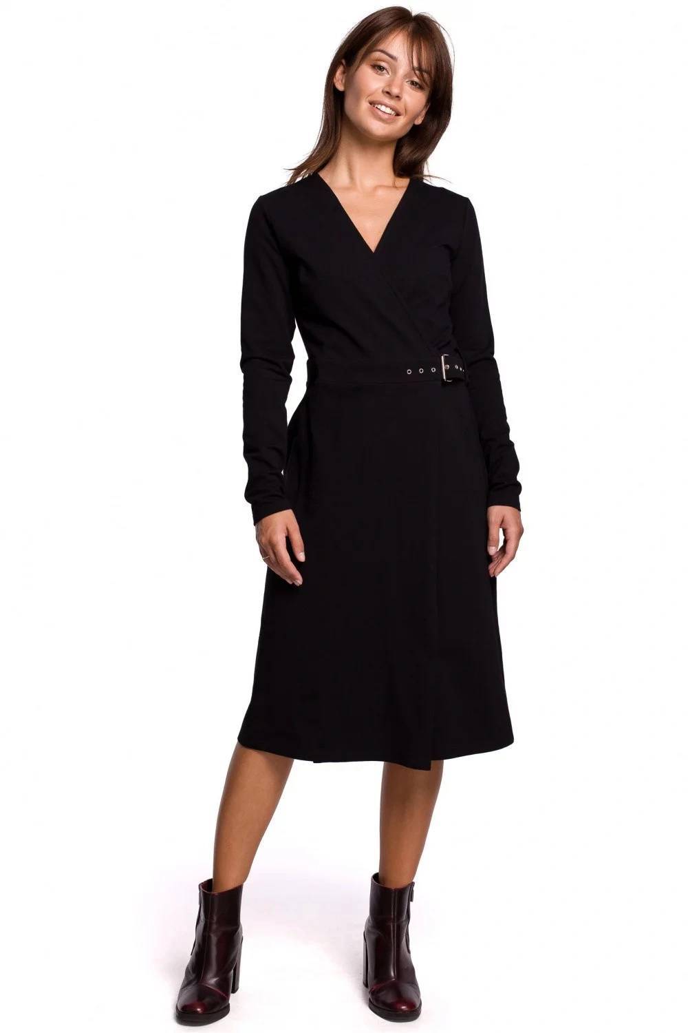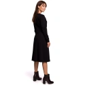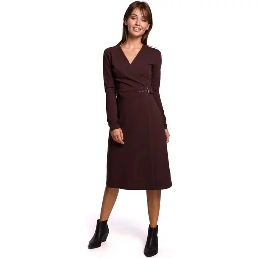 Tieto šaty s dlhými rukávmi z teplého bavlneného úpletu sú ideálnou voľbou na chladnejšie dni. Jednoduchý trapézový strih so zakrytým výstrihom a ozdobným opaskom so sponou na boku jemne zvýrazňuje ženskú siluetu. Šaty sú bez podšívky.