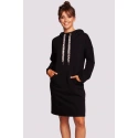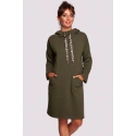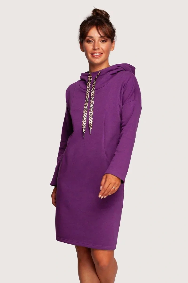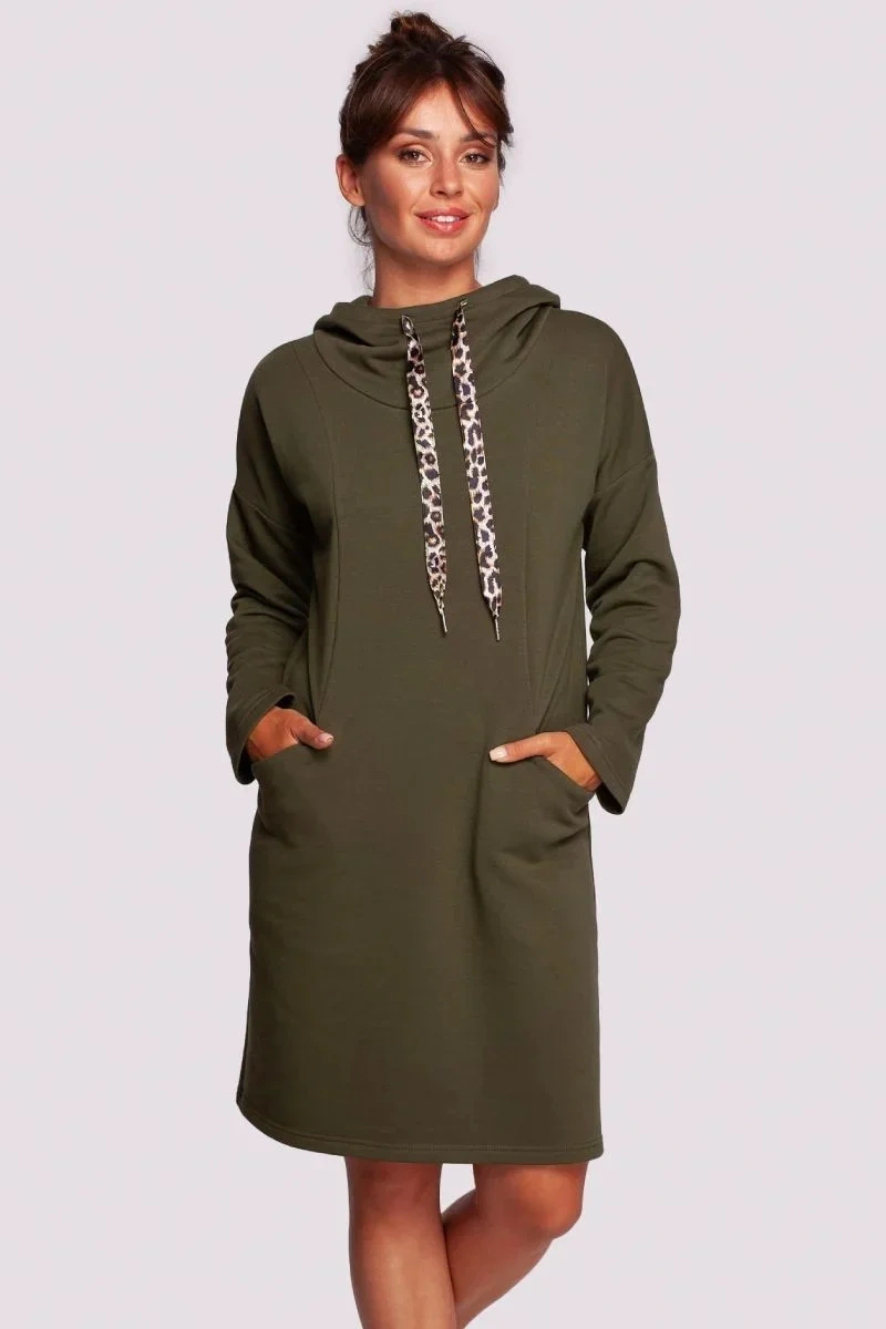 Pohodlné šaty na každodenné nosenie s vysokým golierom, ozdobnými stuhami s leopardím vzorom, kapucňou a vreckami skrytými vo švíkoch na prednom diele. Pletenina prispôsobená telu zaistí pocit tepla a pohodlia.