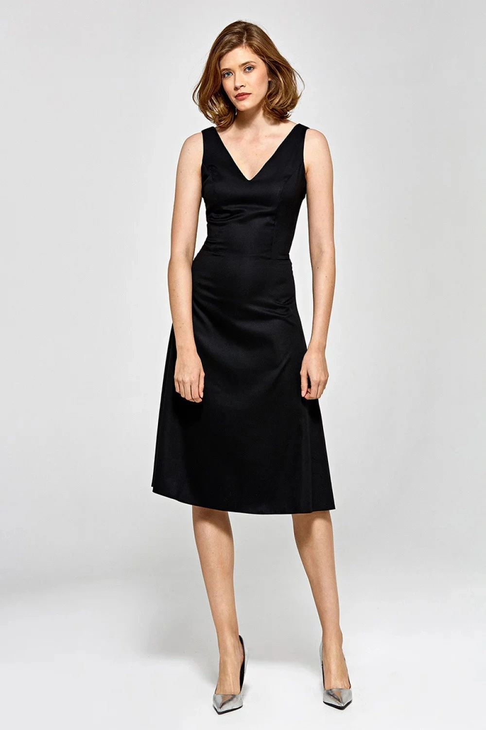Dámske šaty s klasického strihu v retro štýle. S jemnou krčný golier. Model je vyrobený z mäkkého ma