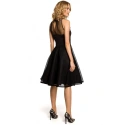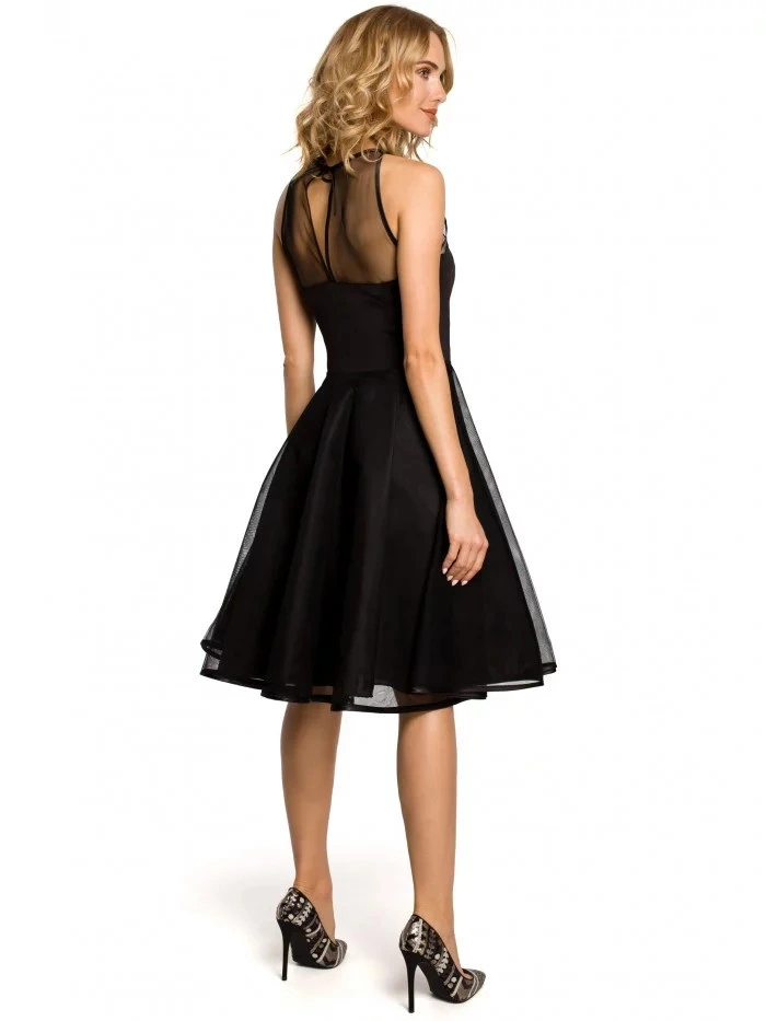 Večerné šaty s dĺžkou po kolená, so sieťovaným sedlom a sukňou. Prešité detaily a zaväzovanie na chrbte s kľúčovou dierkou.